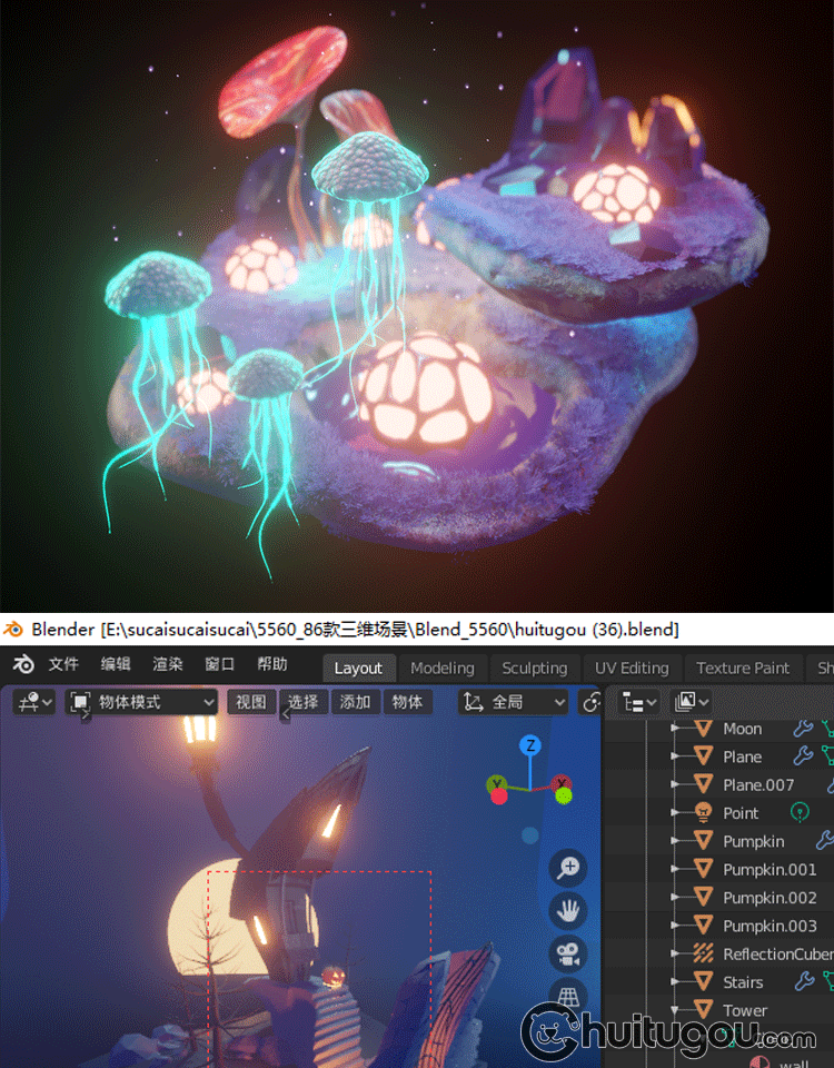 Blender卡通lowpoly场景3D模型工程源文件 房间建筑科幻自然岛屿