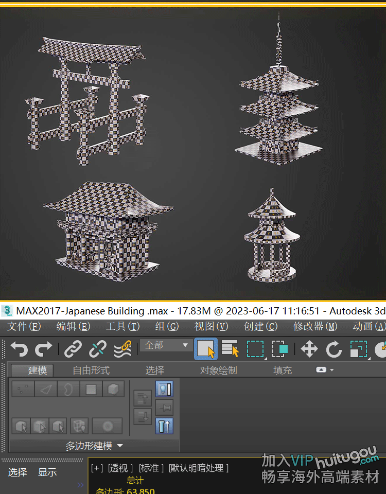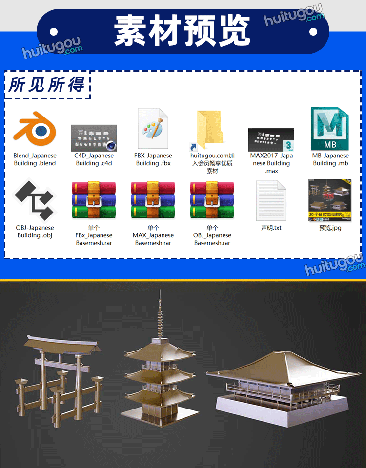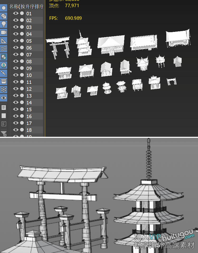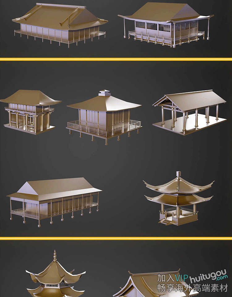 C4D亚洲唐朝日式庭楼寺庙建筑3D模型FBX白模OBJ建模设计素材MAYA
