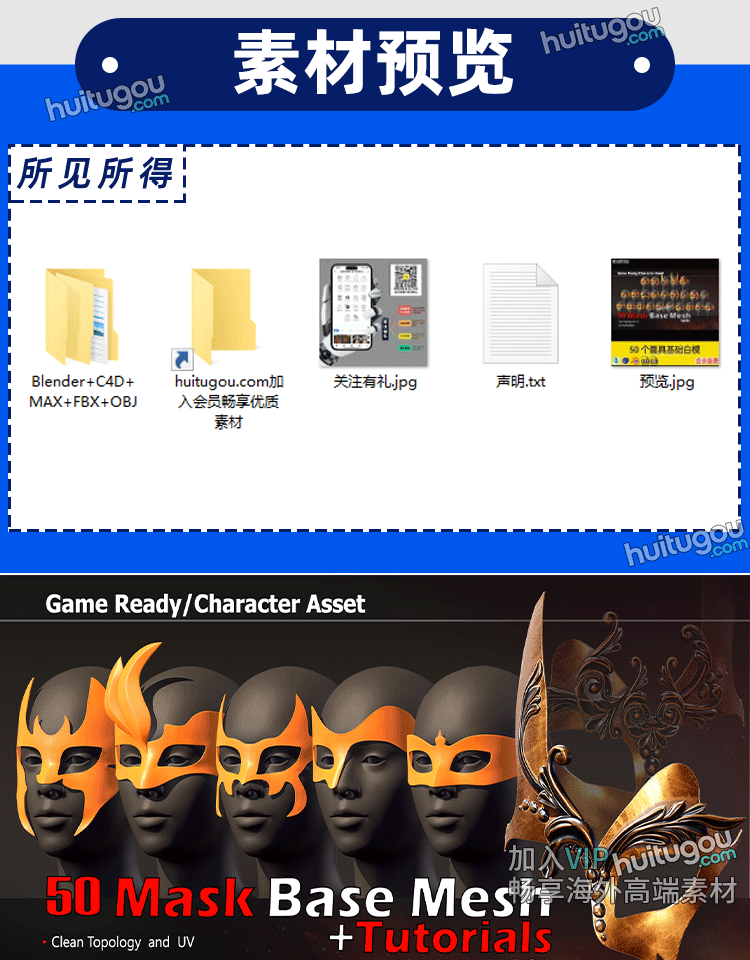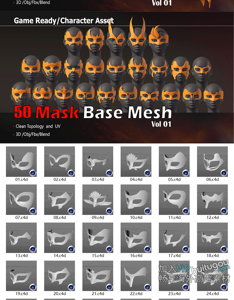 50个面具基础白模3D模型Blender素材C4D建模渲染FBX格式OBJ源文件