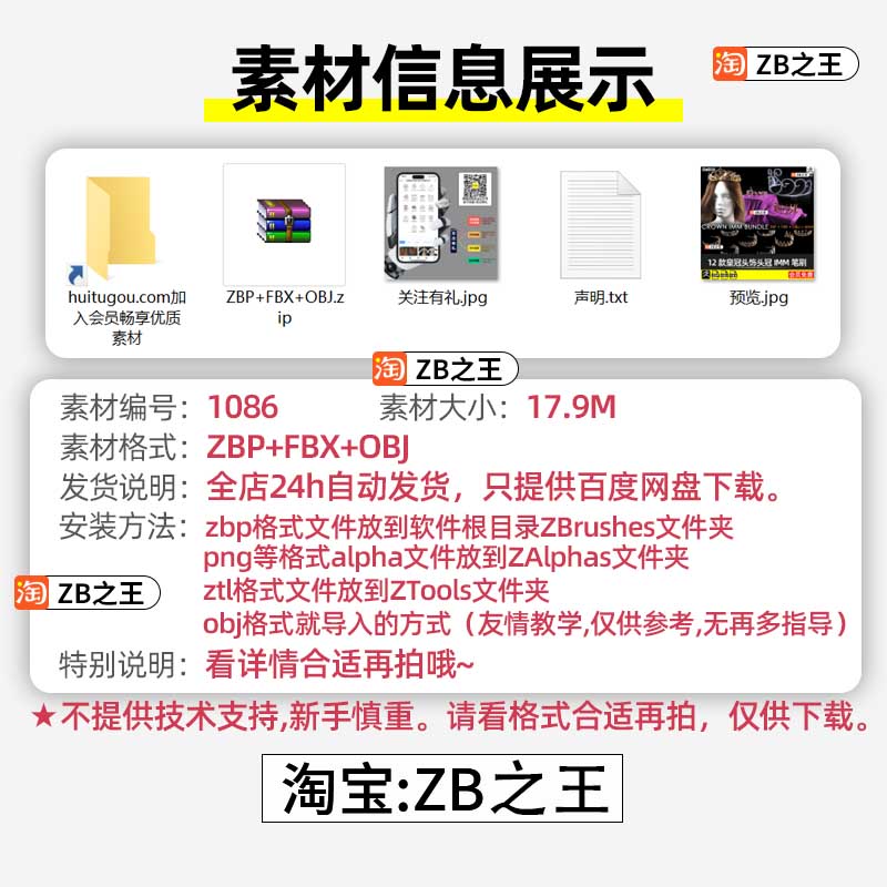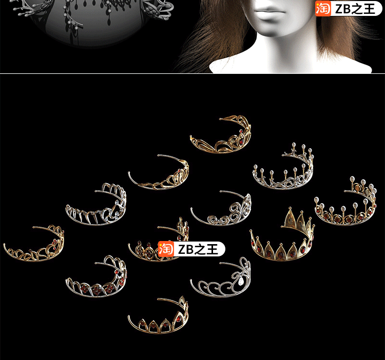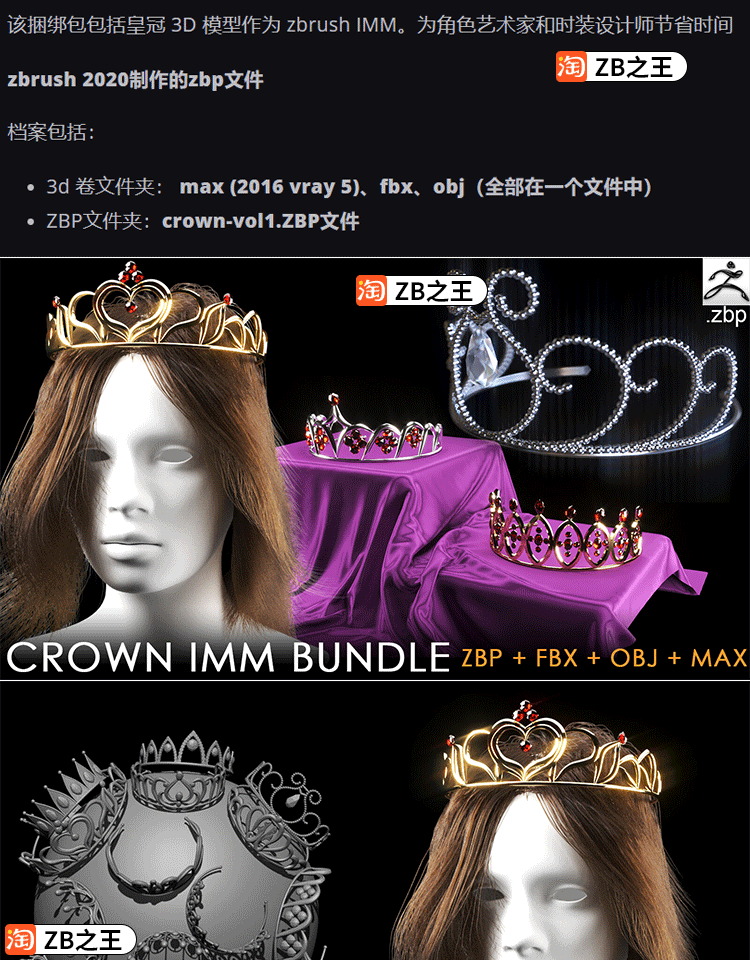 ZBrush笔刷ZB雕刻12款皇冠头饰头冠IMM插入笔刷素材FBX模型OBJ