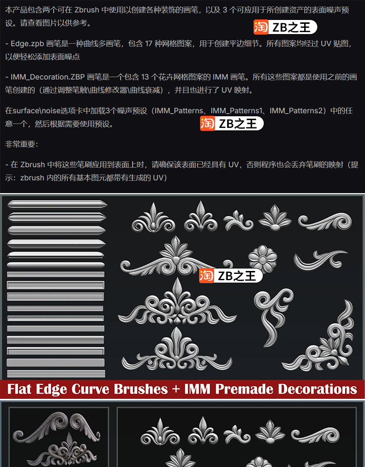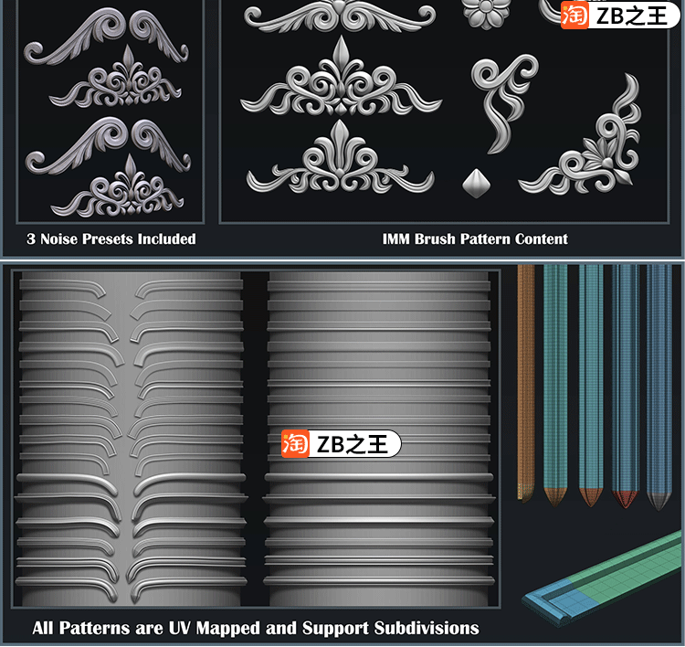 ZBrush素材17款线条曲线ZBP笔刷+13款雕花IMM笔刷ZB雕刻建模