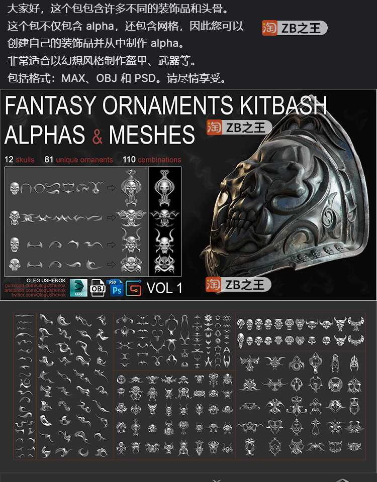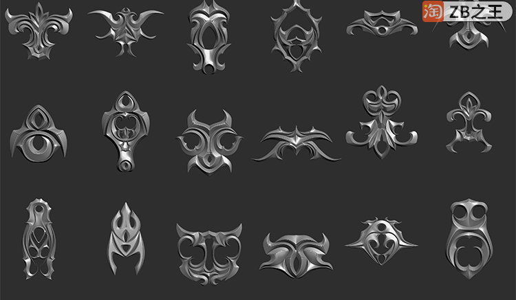 ZBrush素材200多款幻想和头骨装饰雕花Alpha笔刷带3D模型OBJ MAX