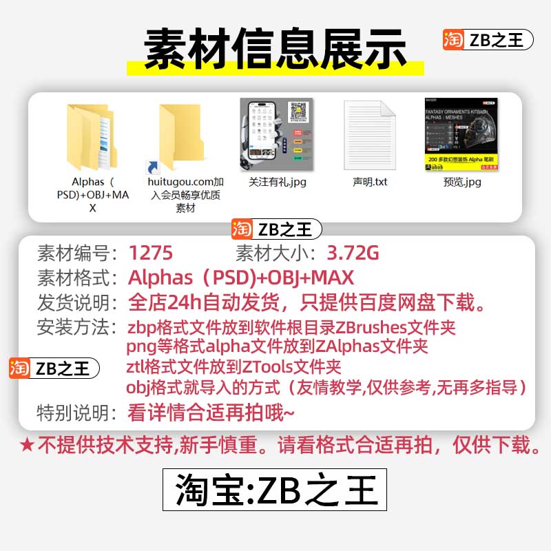 ZBrush笔刷ZBP素材50款欧式建筑花纹装饰雕花Alpha笔刷FBX模型OBJ