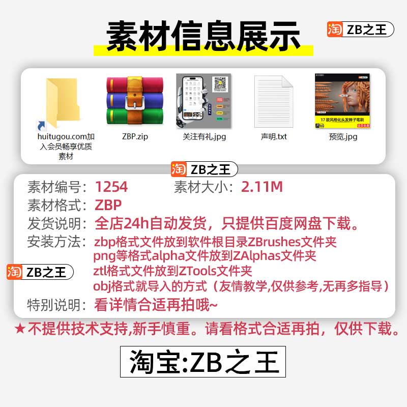 ZBrush素材14款风格化人物头发动物毛发皮毛ZBP笔刷ZB建模雕刻