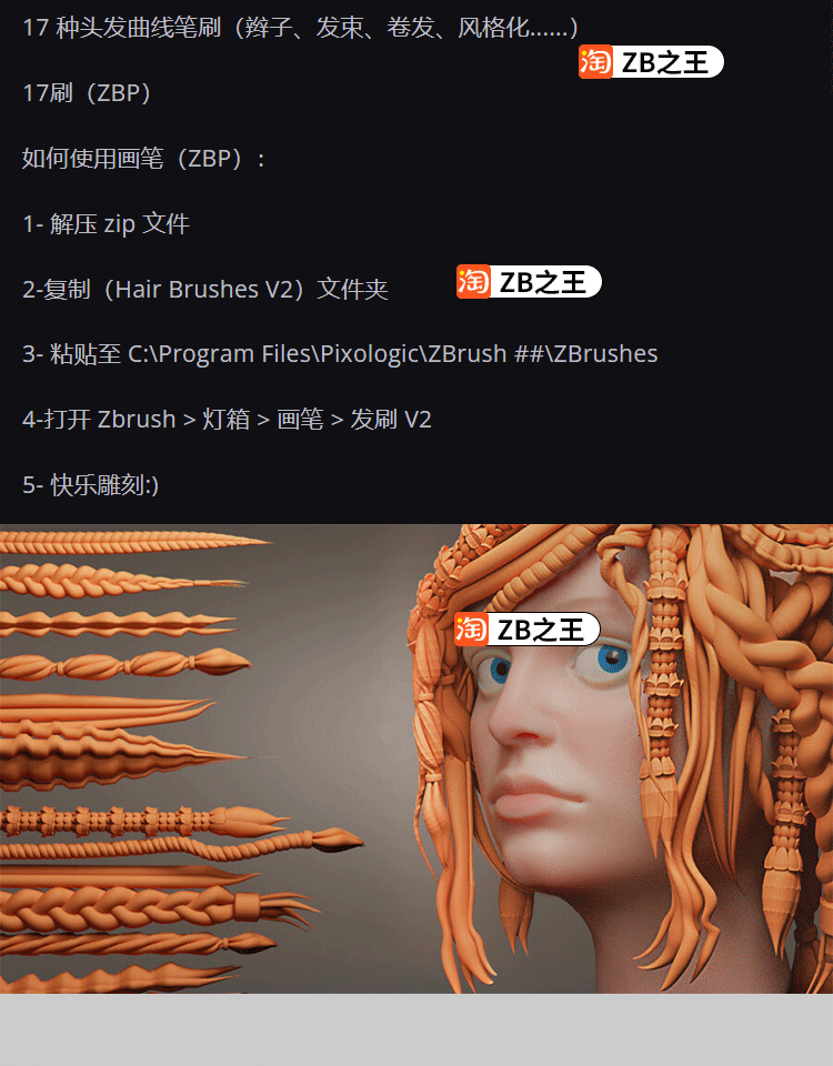 ZBrush素材17款卡通风格化发束人物头发辫子卷发ZBP笔刷ZB雕刻