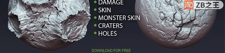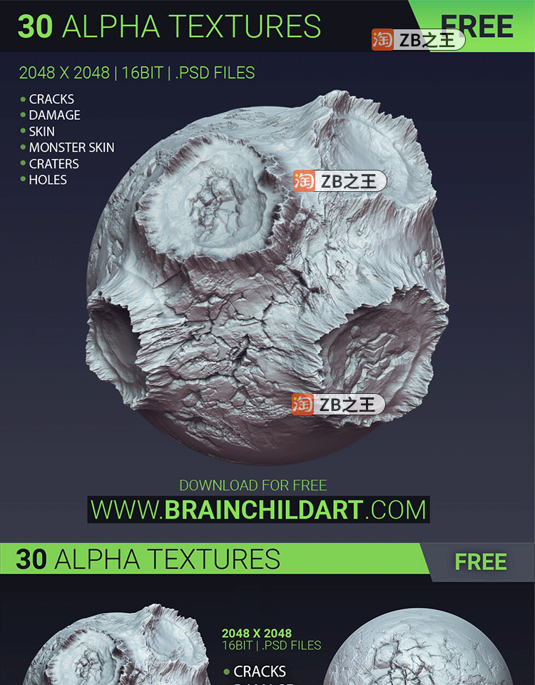 ZBrush素材30款陨石坑裂缝破损损坏Alpha笔刷PSD格式ZB建模雕刻