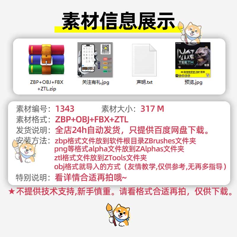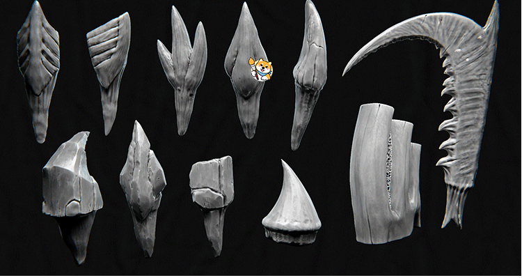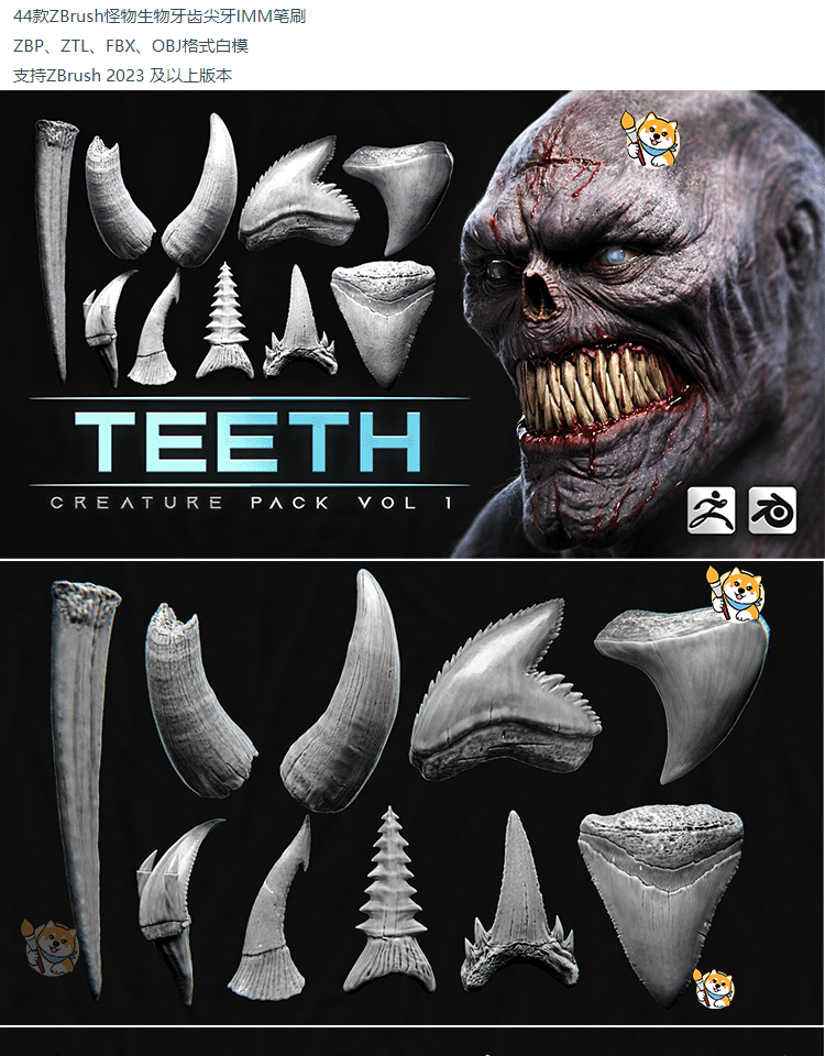 ZBrush笔刷44款怪物生物牙齿獠牙ZBP笔刷带ZTL工程和OBJ模型FBX