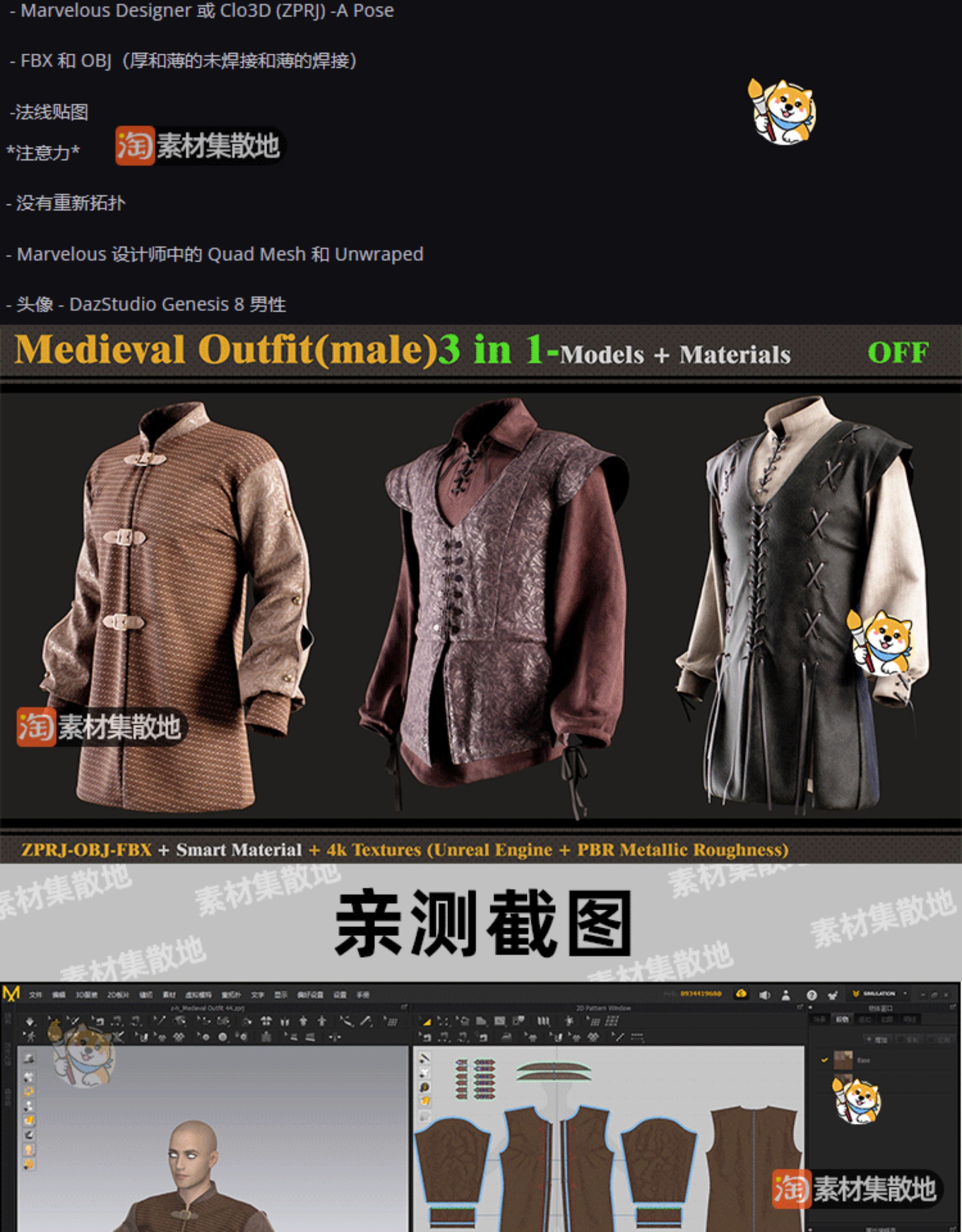 3款clo3d中世纪男性上衣服装外套皮夹克套装ZPRJ模型打版纸样文件