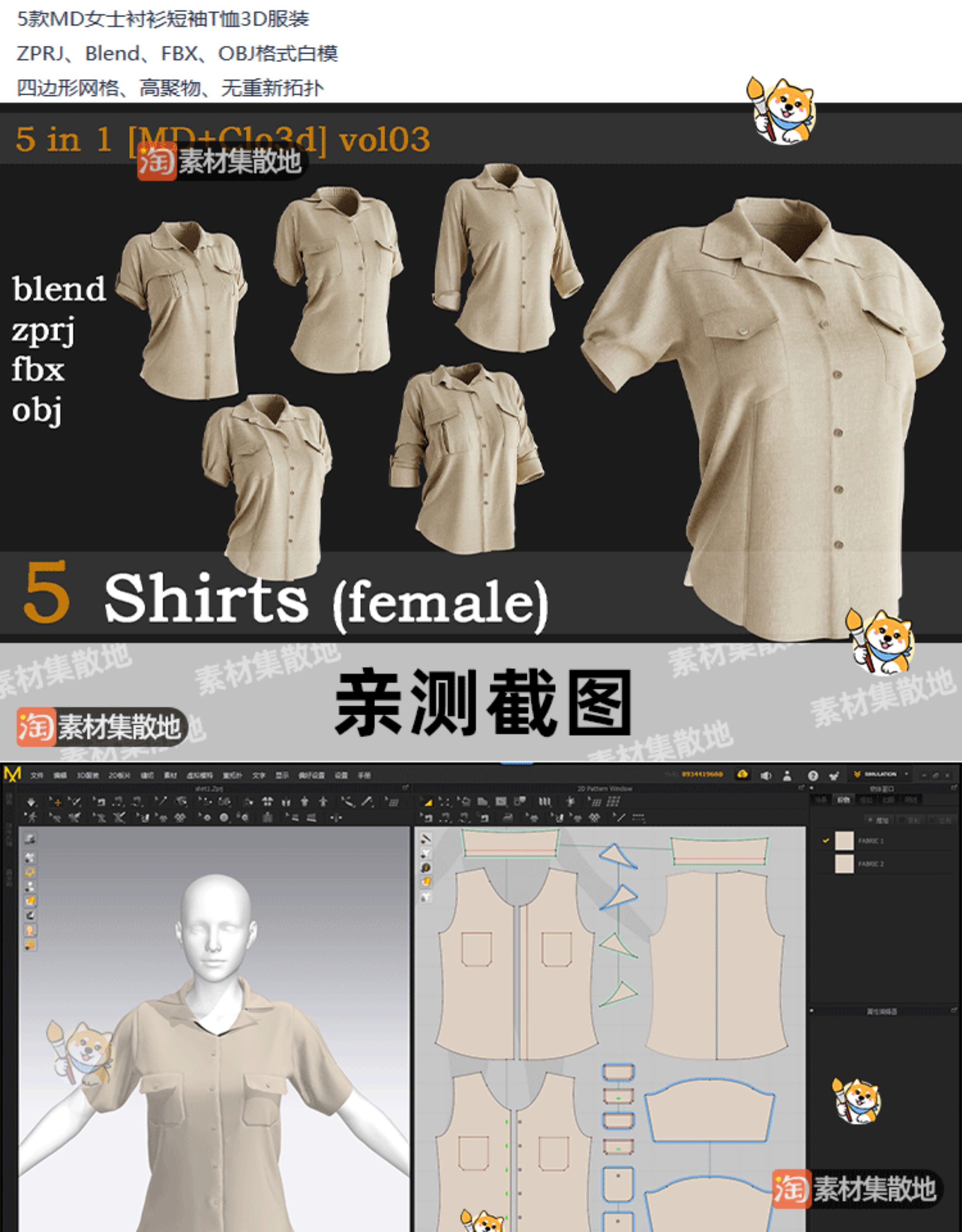 5款女士衬衫基础版型clo3d服装短袖上衣衬衣ZPRJ模型打版文件OBJ