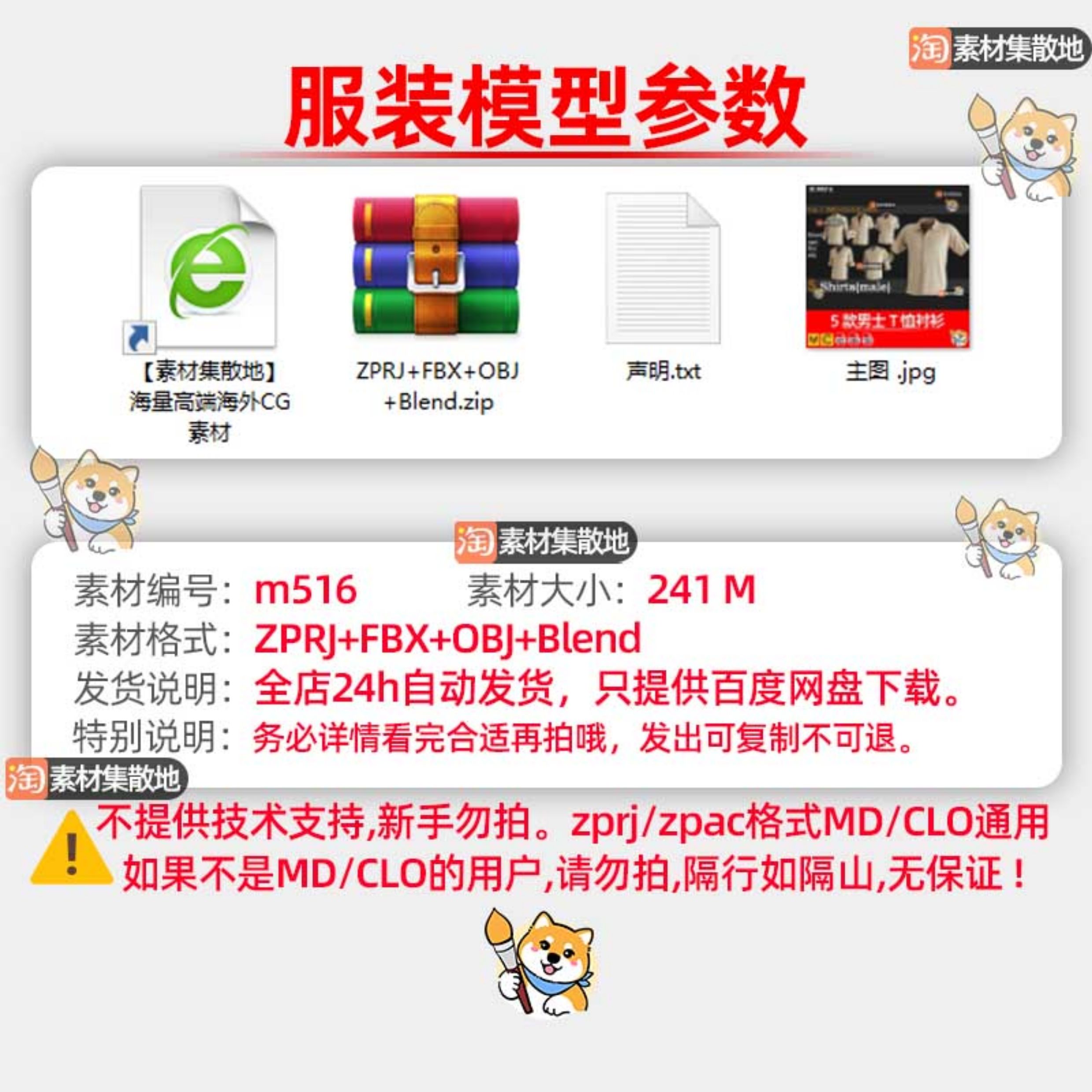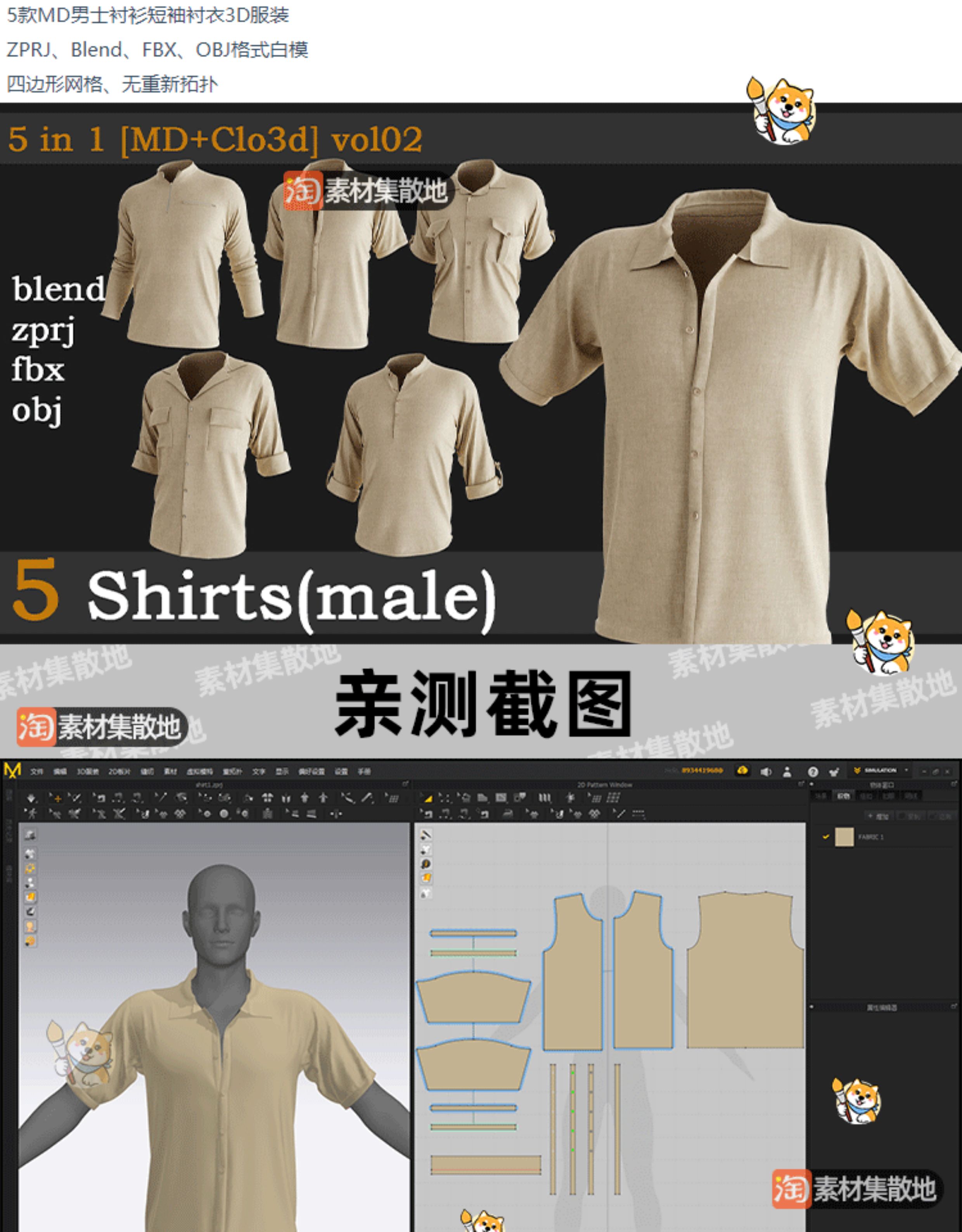 5款男士T恤衬衫服装CLO3D短袖衬衣套装ZPRJ模型打版纸样工程文件