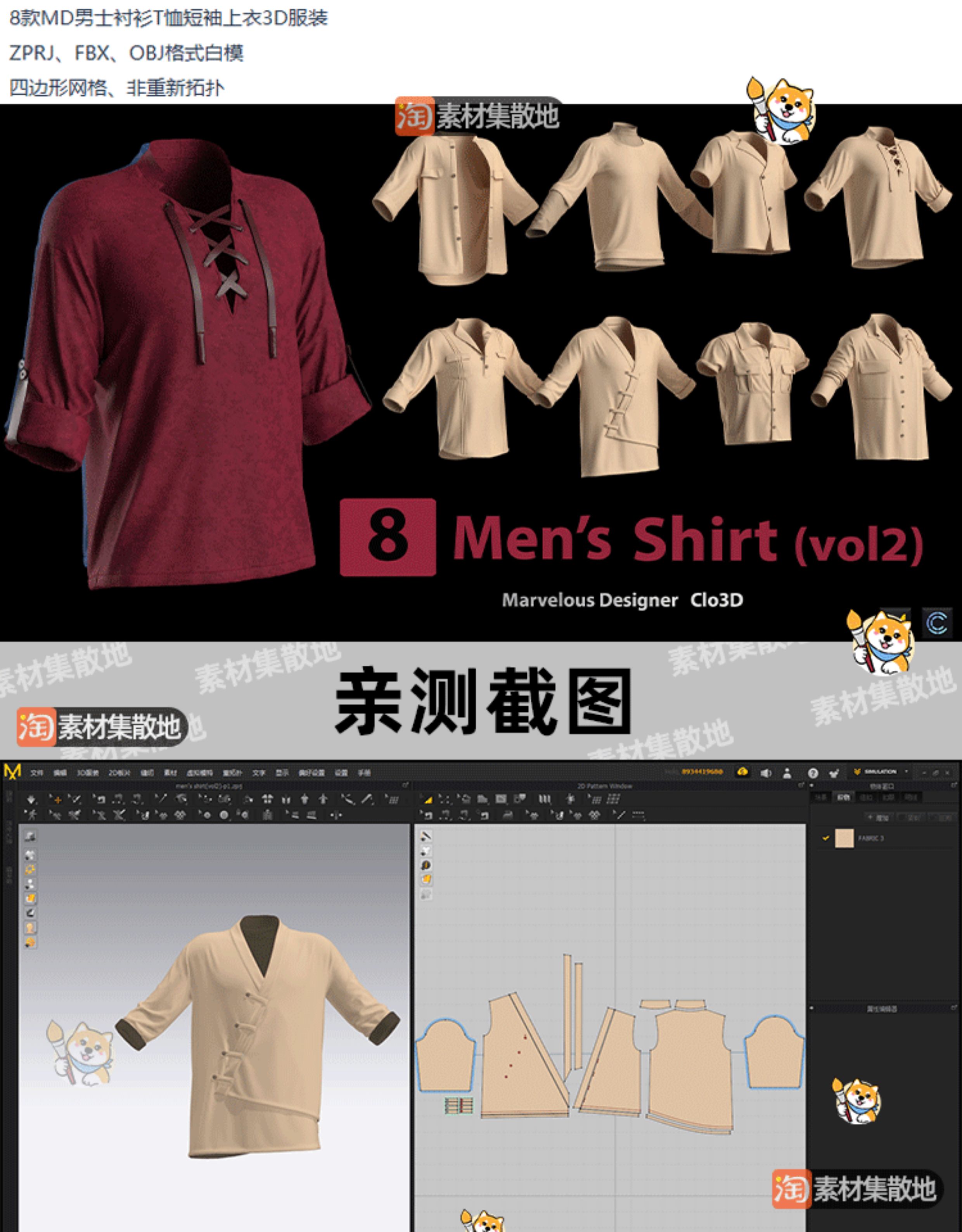 8款男士上衣衬衫T恤CLO3D服装T恤短袖长袖衫ZPRJ模型打版纸样文件