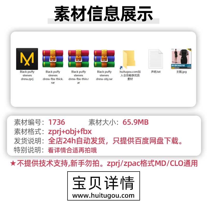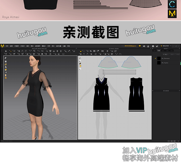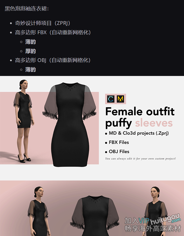 MD衣服素材CLO3D女士黑色蓬松袖连衣裙ZPRJ服装打版工程源文件OBJ