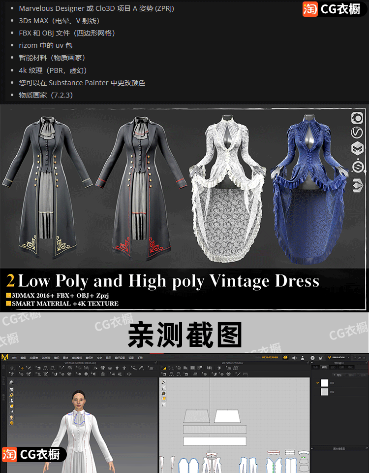 CLO3D服装素材MD复古女装连衣裙花边裙子OBJ模型ZPRJ纸样工程文件