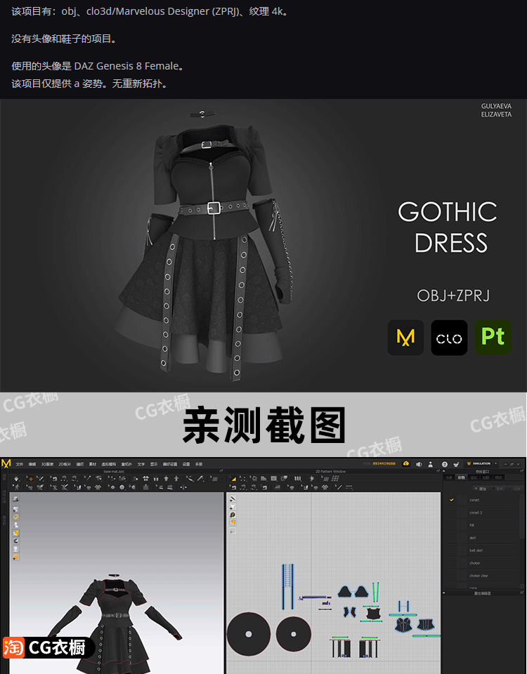 MD模型CLO3D衣服素材哥特式连衣裙套装基础版型ZPRJ工程纸样文件