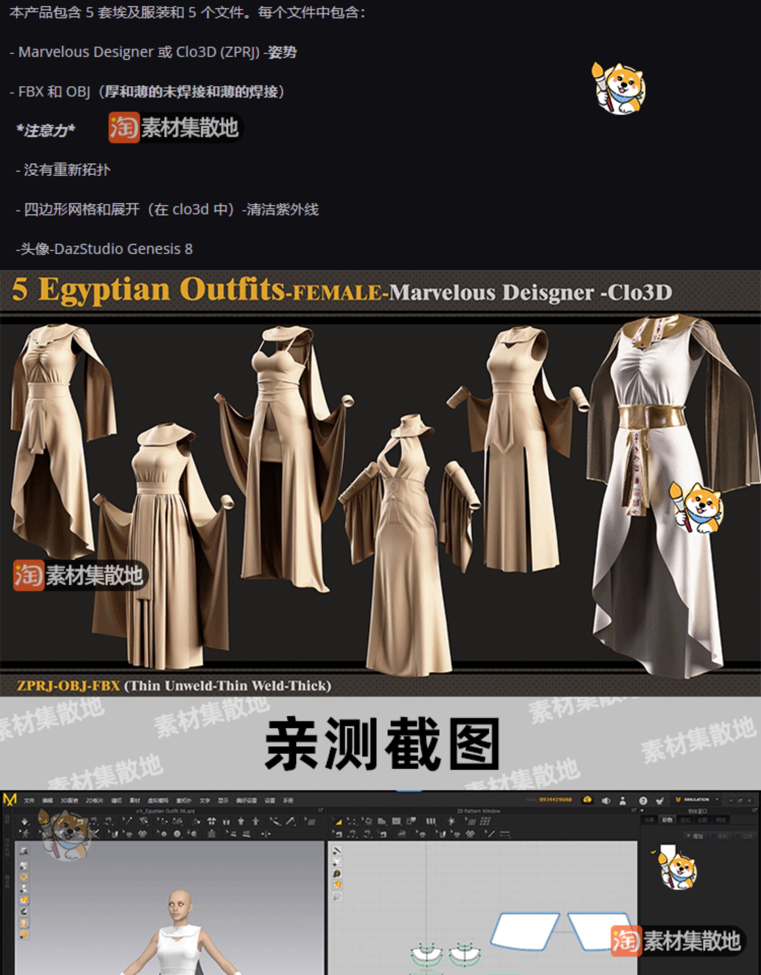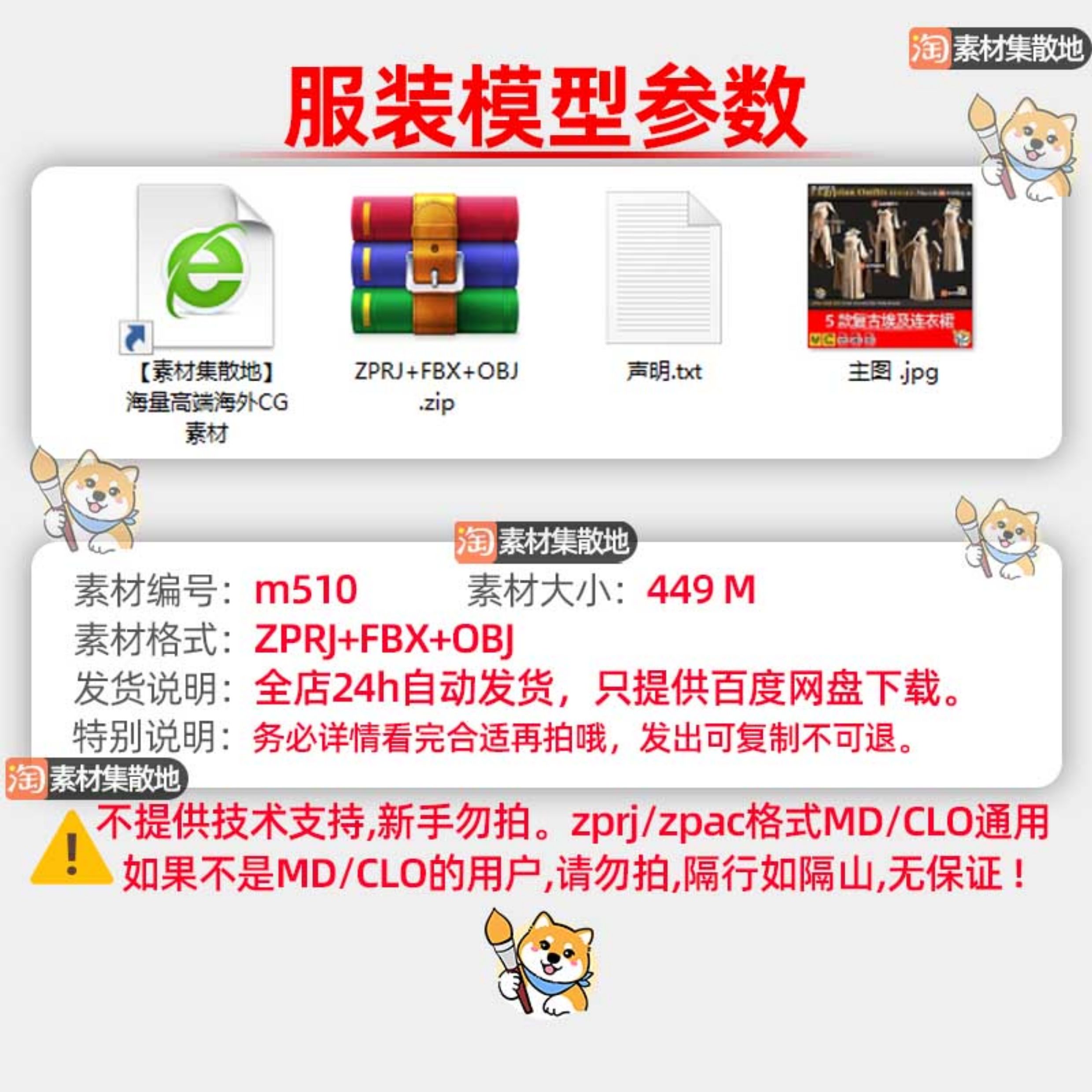 5款clo3d复古埃及连衣裙3D服装女性礼服长裙套装ZPRJ模型打版文件