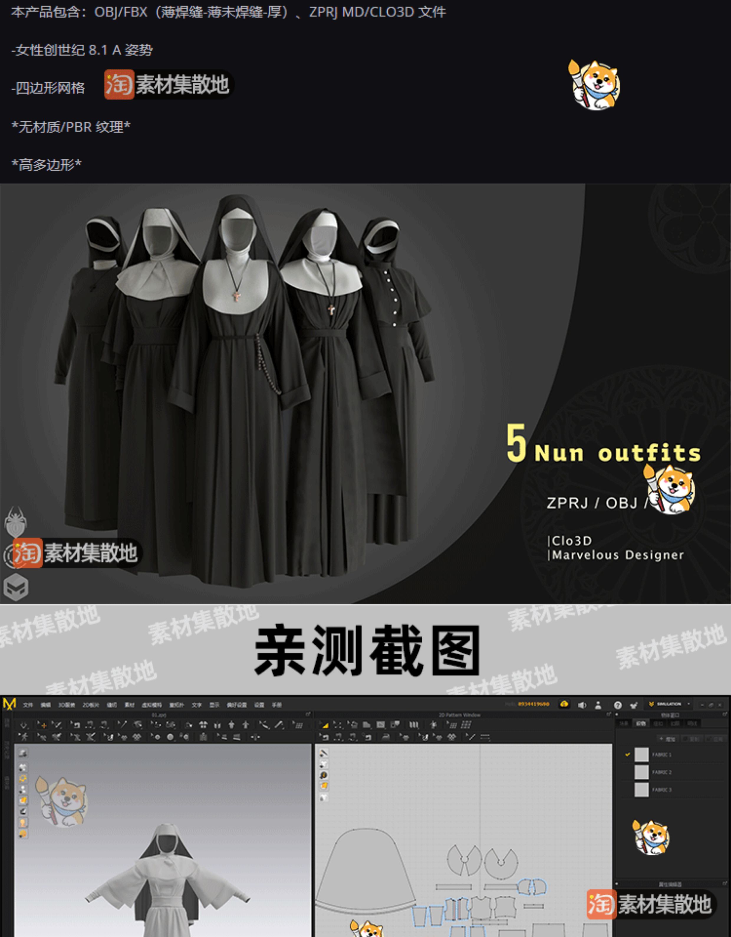 5款女士修女制服clo3d服装兜帽上衣披肩连衣裙ZPRJ模型打版文件
