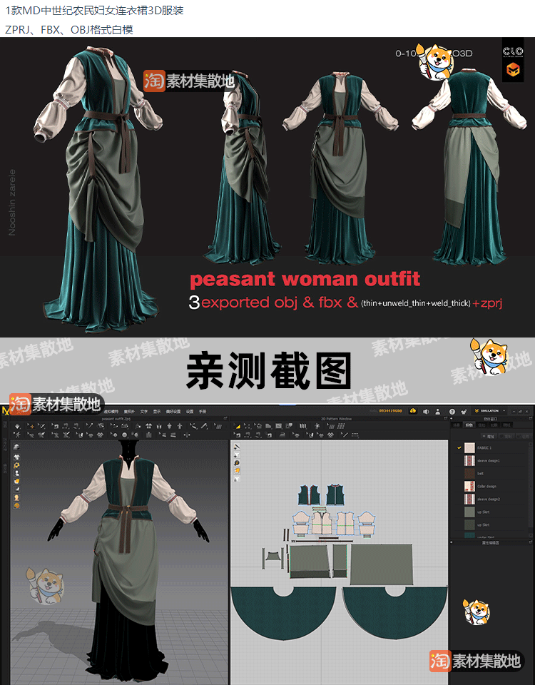 MD中世纪农民妇女套装CLO连衣裙服饰ZPRJ模型打版源文件3D服装OBJ