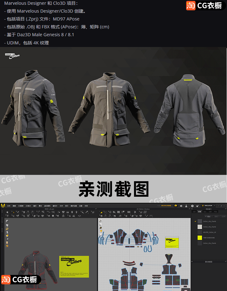 MD素材文件CLO3D科技风格夹克外套上衣服装打版纸样工程源文件OBJ