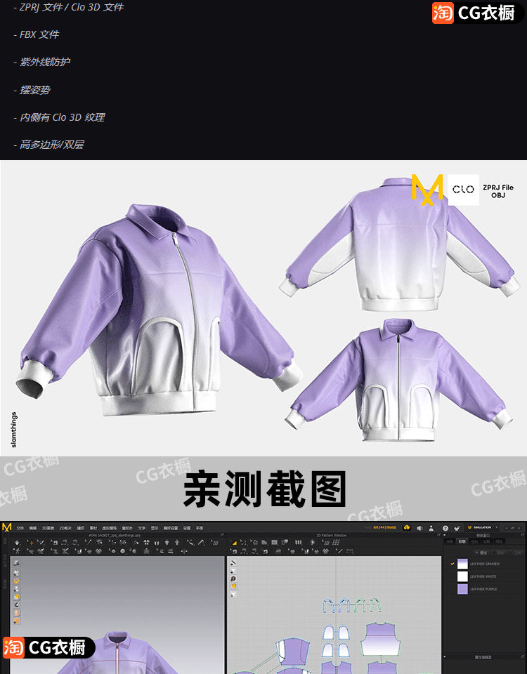 CLO3D服装素材MD街头服饰皮夹克外套上衣ZPRJ衣服建模打版3D工程