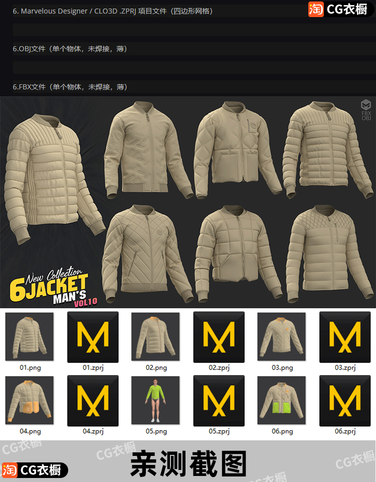 MD衣服模型6款男装冬装棉衣羽绒夹克CLO3D服装3D素材ZPRJ纸样工程