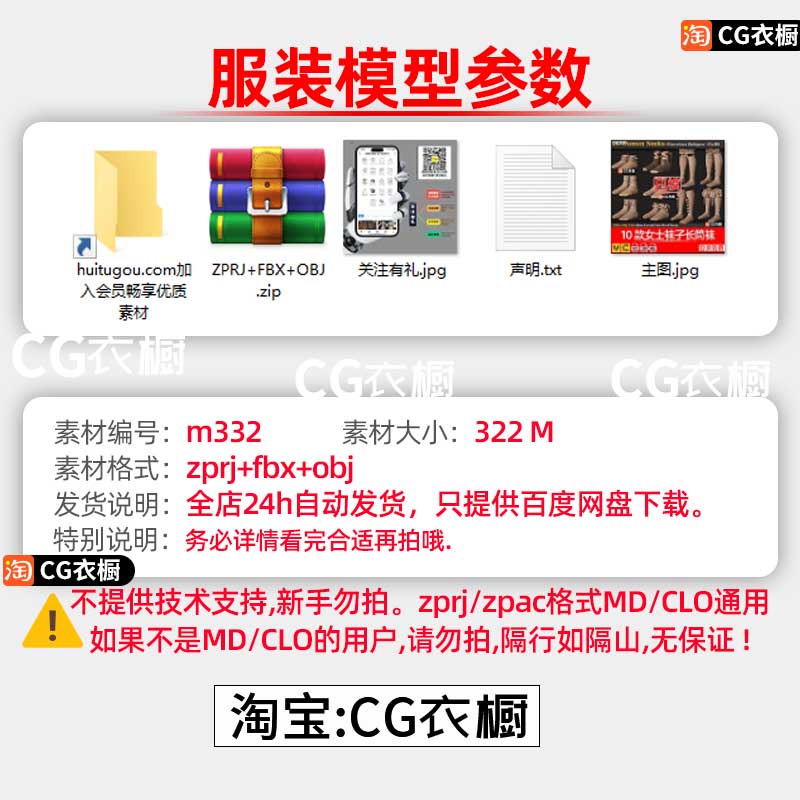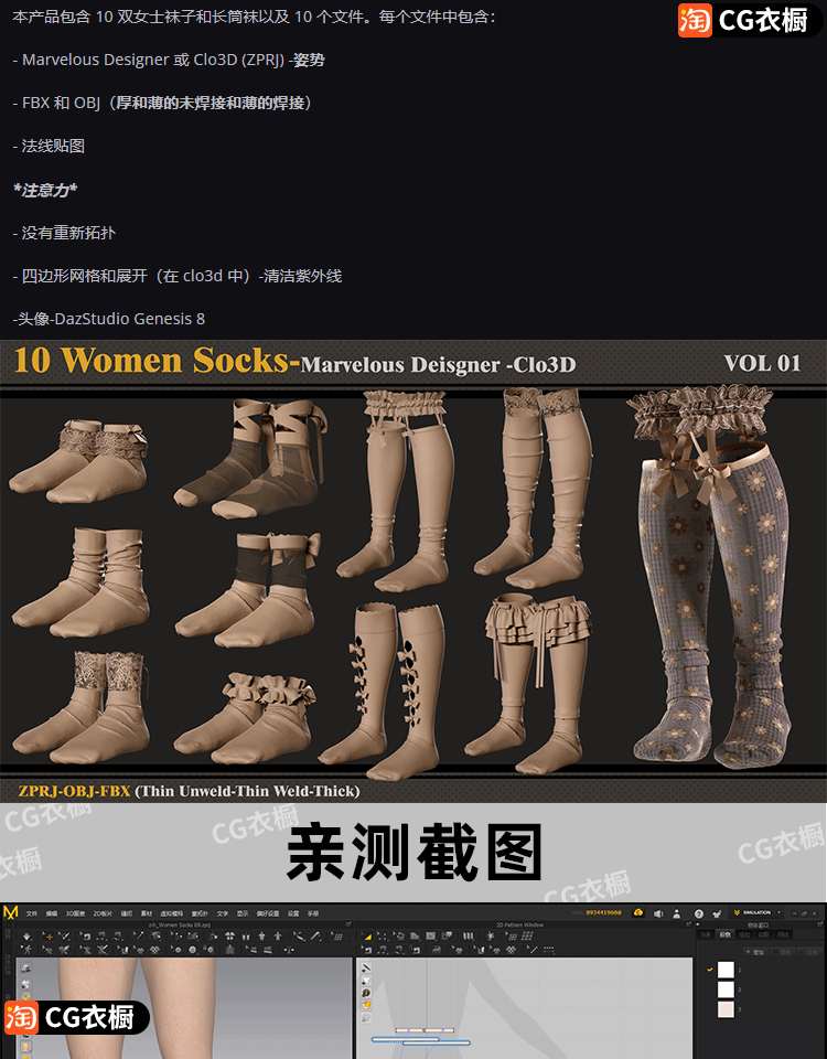 MD素材CLO3D服装配饰10款女士袜子长筒袜纸样打版ZPRJ工程源文件