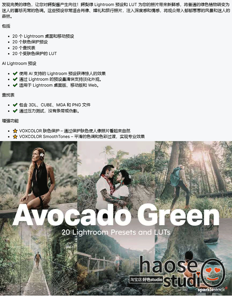 lr人像旅拍LUT风格化调色PS牛油果色调照片调色20款Avocado Green