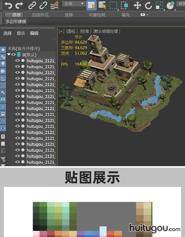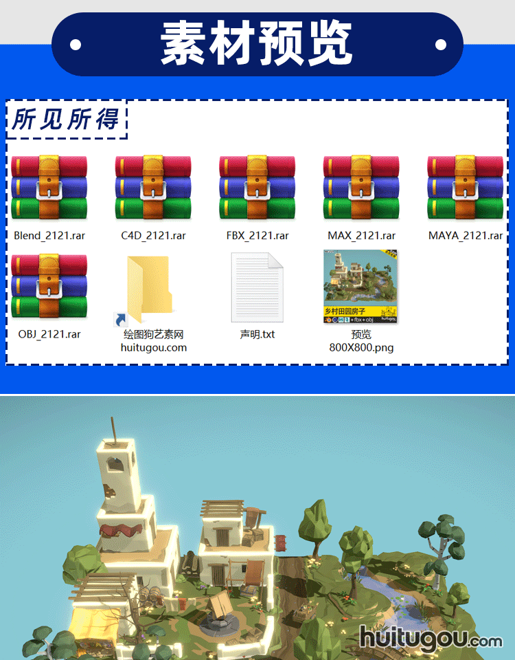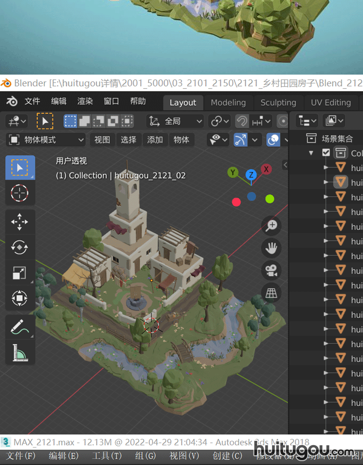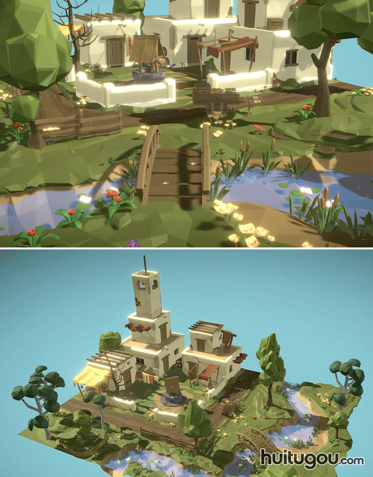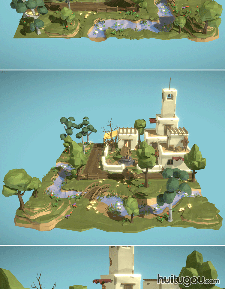 低面古风乡村房子C4D自然树木花草Blender小河溪流田地FBX OBJ mb