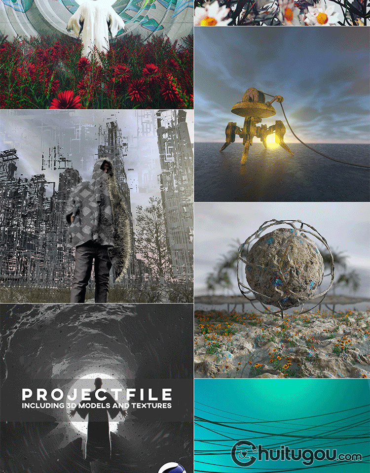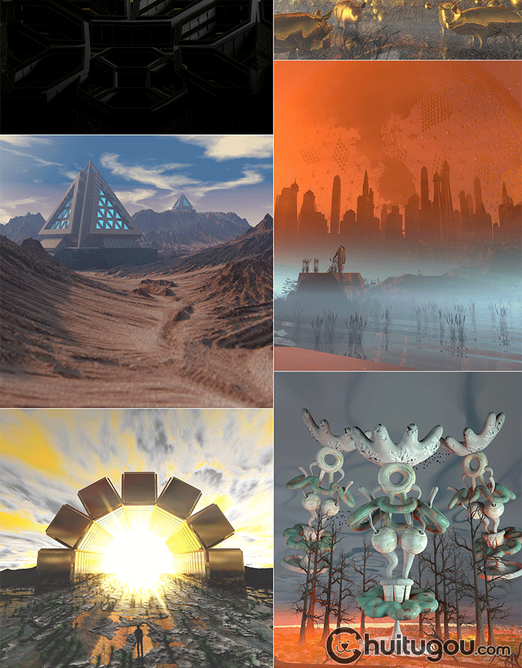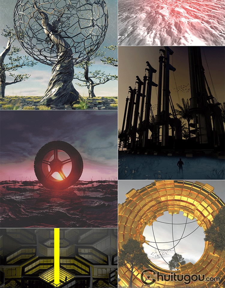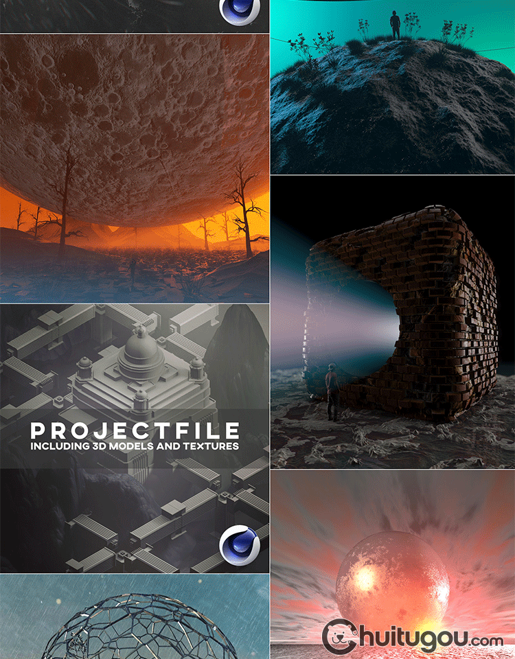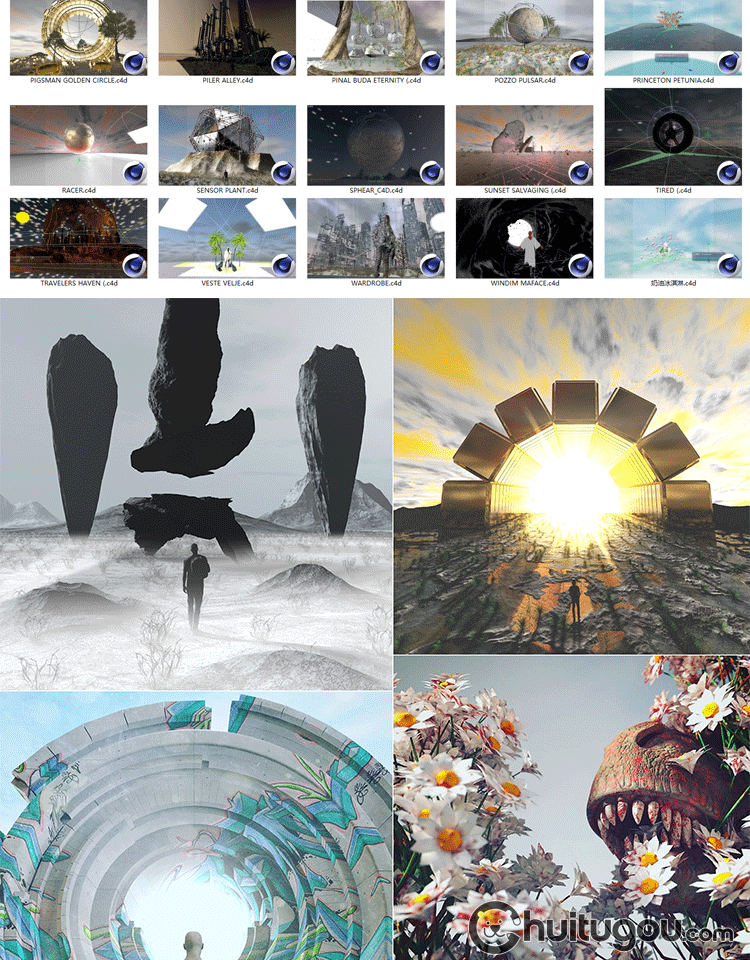 C4D自带渲染创意科幻梦幻3D场景模型 幻想建筑人物传送门渲染素材