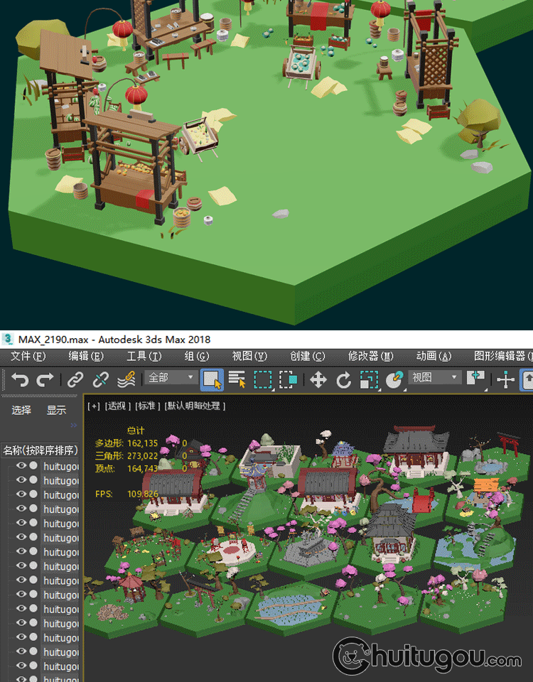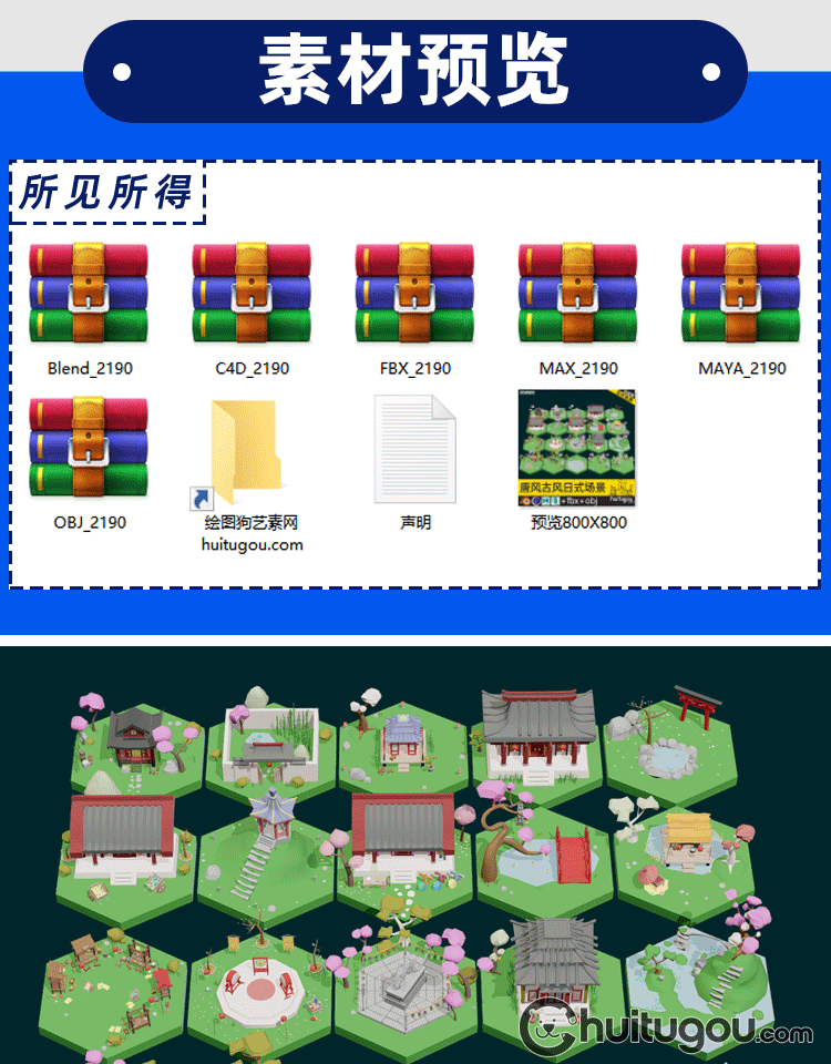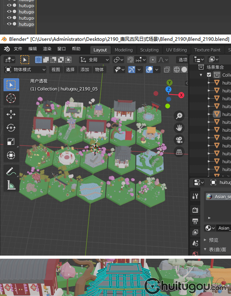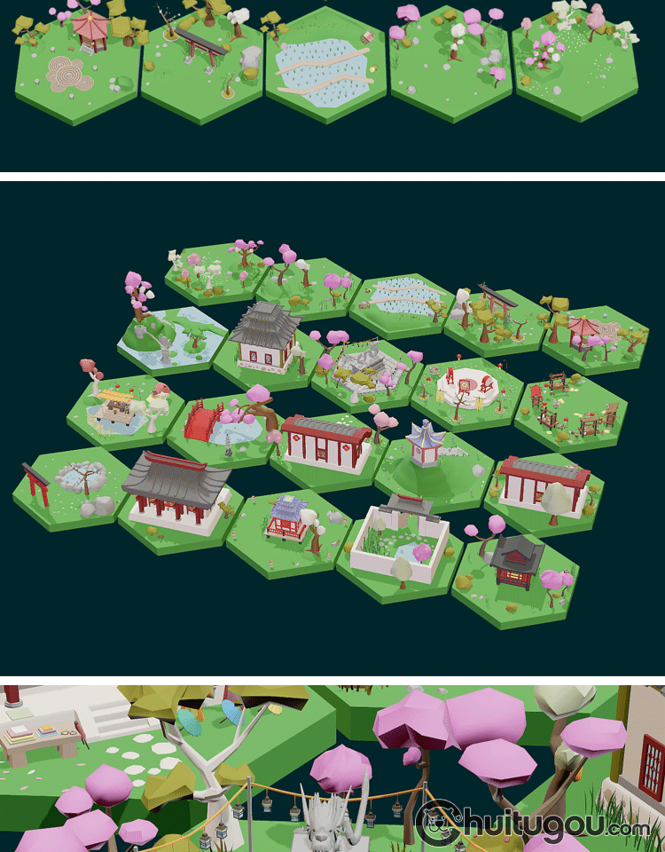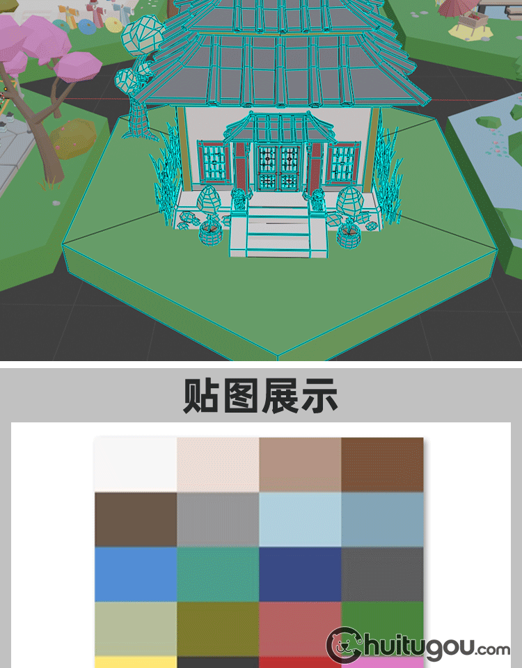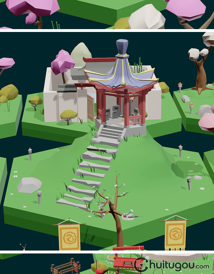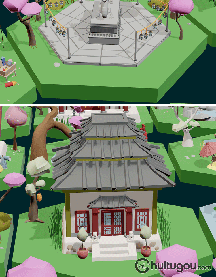 低面 古风微缩场景集Blend唐风日式C4D锣鼓凉亭FBX寺庙龙庭院OBJ