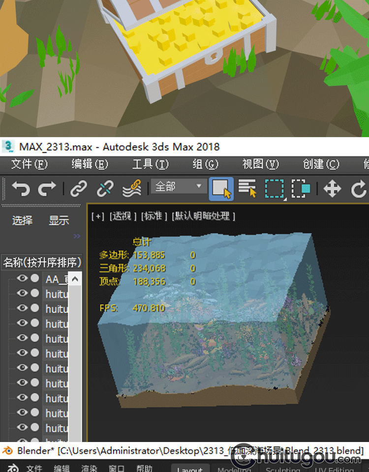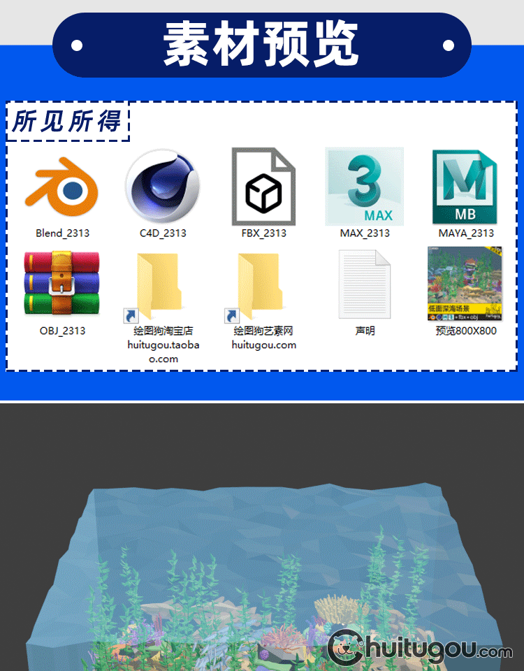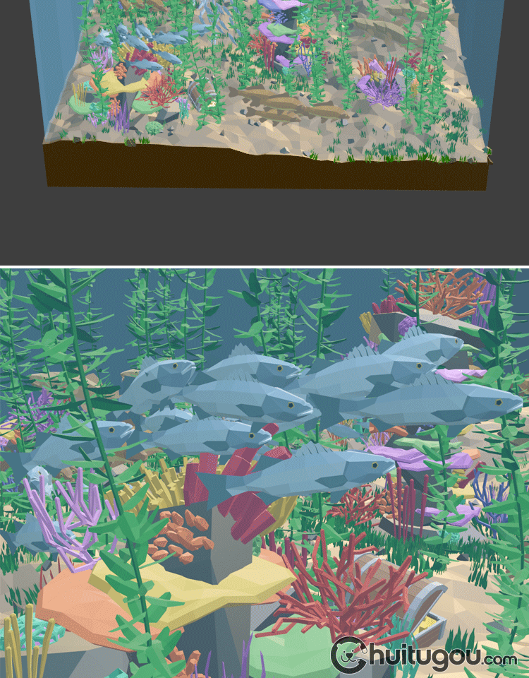 低面 深海鱼群模型C4D卡通水族馆Blend海草红珊瑚鱼儿FBX素材文件
