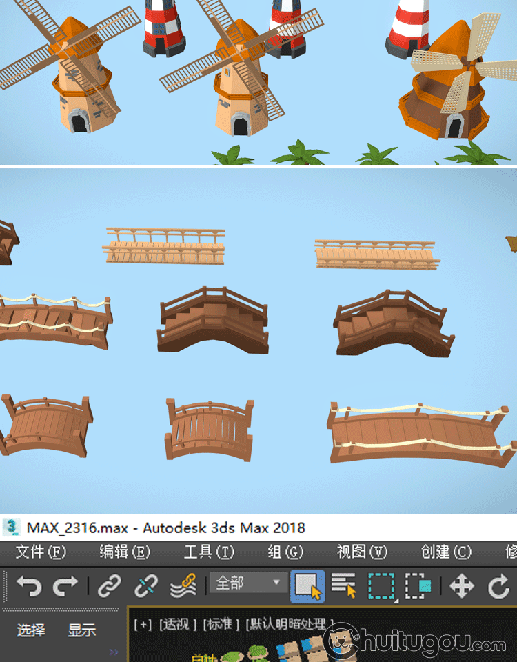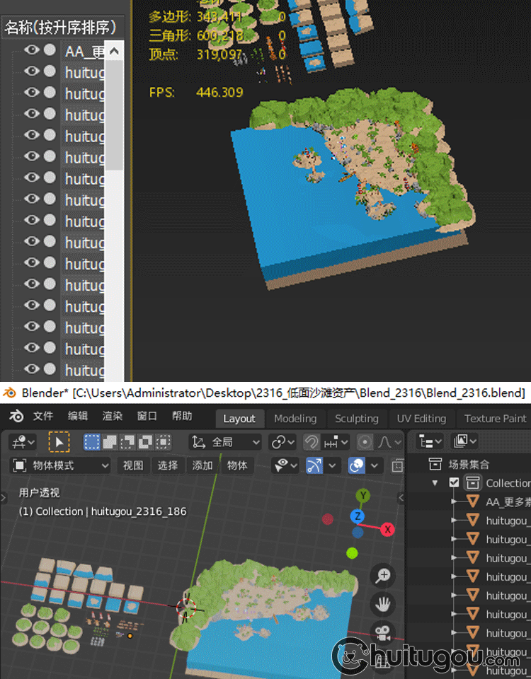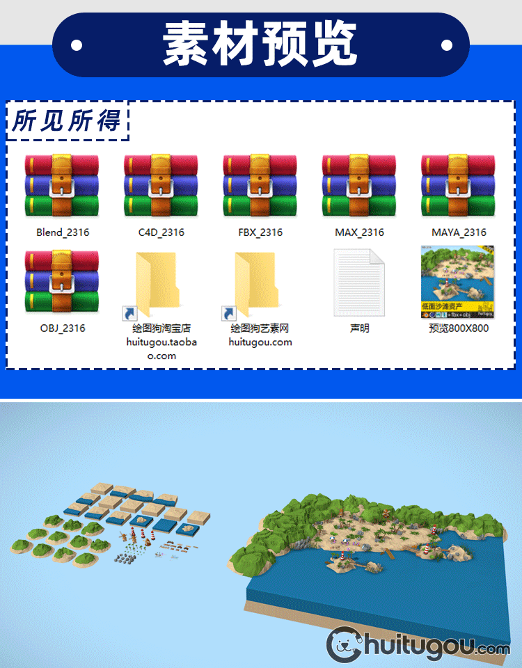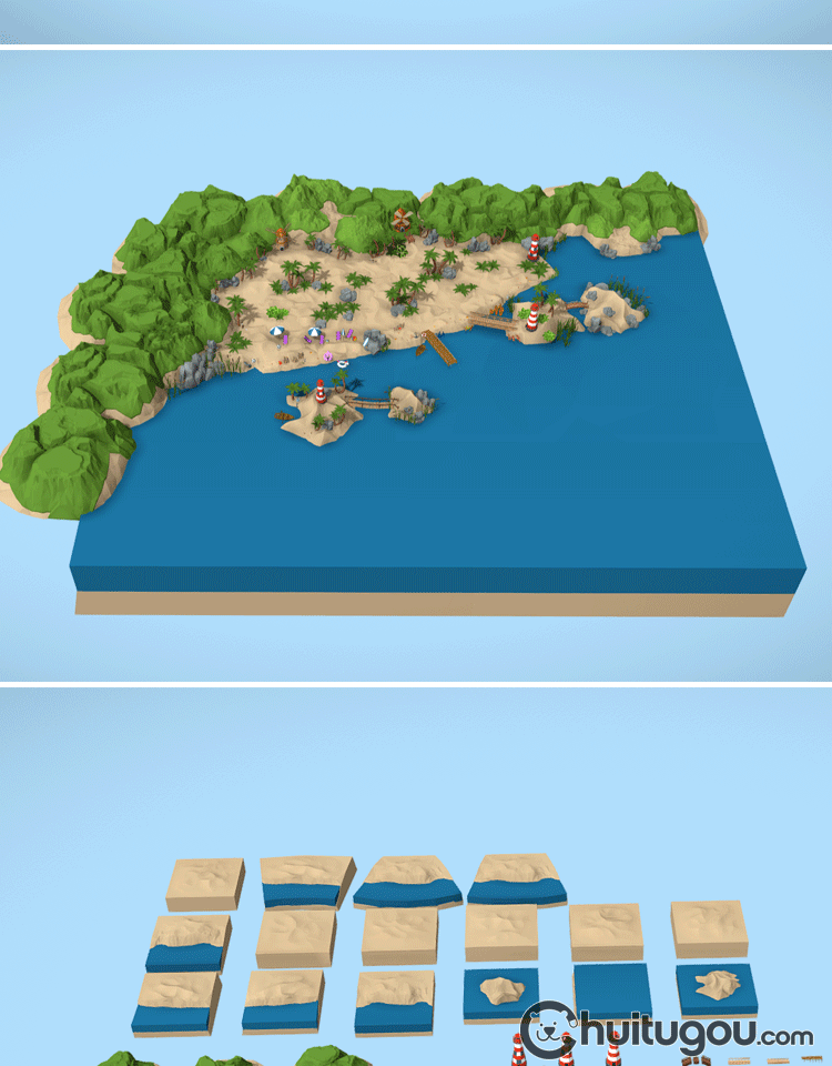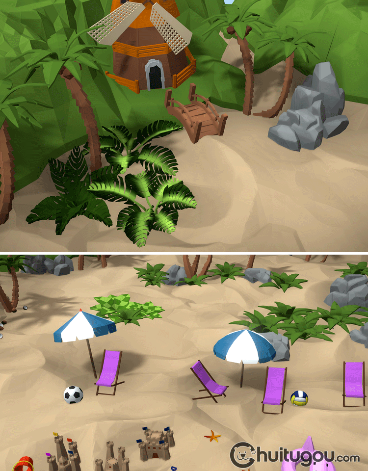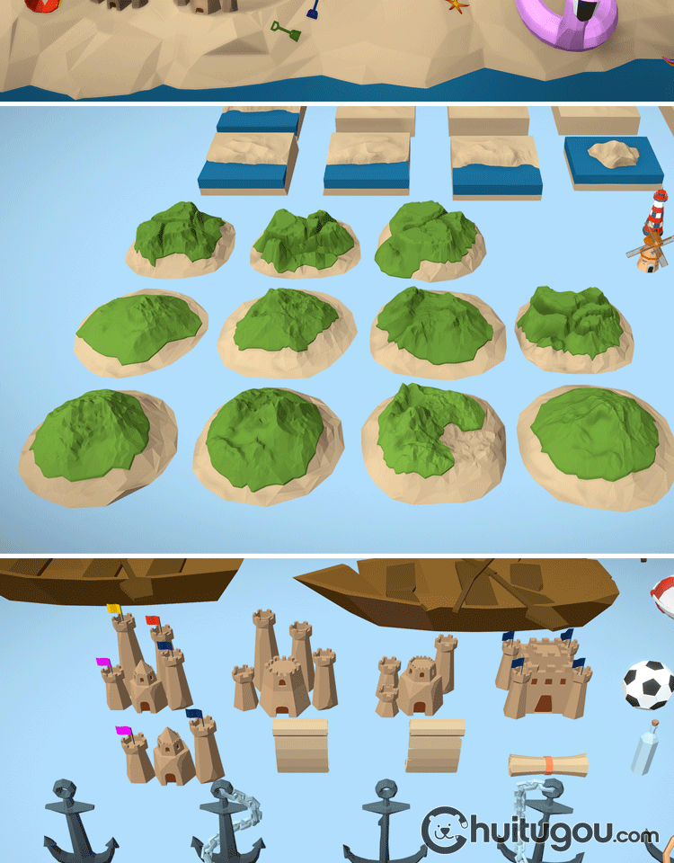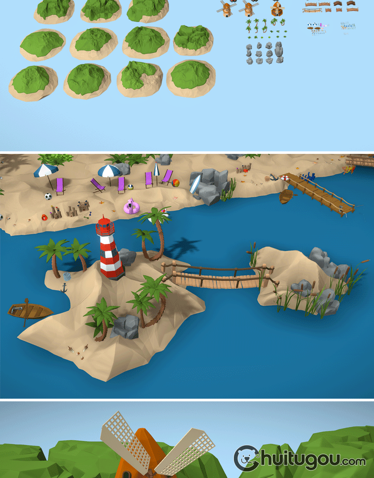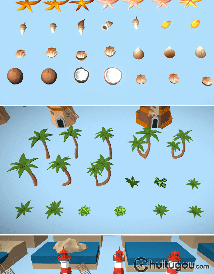 低面沙滩模型Blend灯塔风车C4D椰树雨伞救生圈海星贝壳水草植物3D