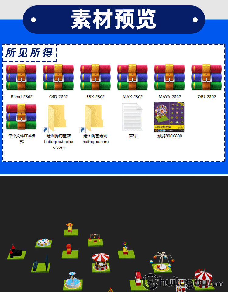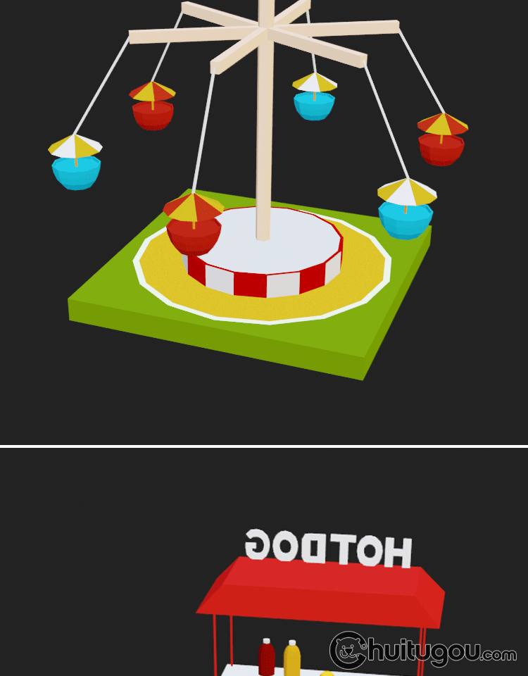 3D低面卡通公园乐园模型C4D游乐场场景FBX摩天轮商店MAYA素材OBJ