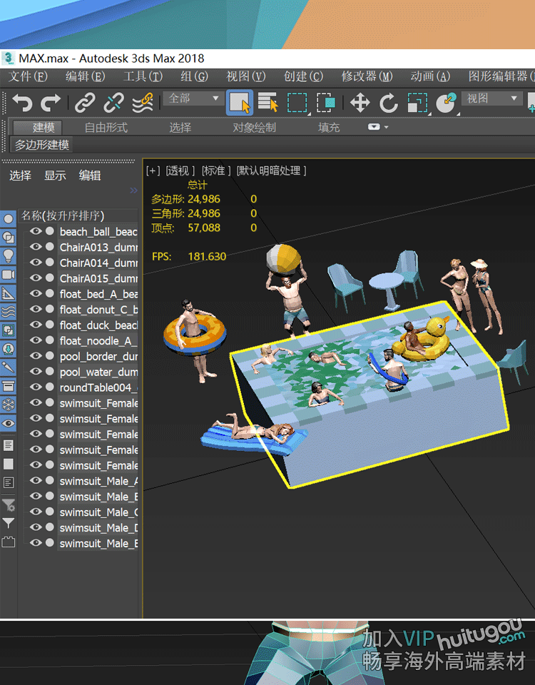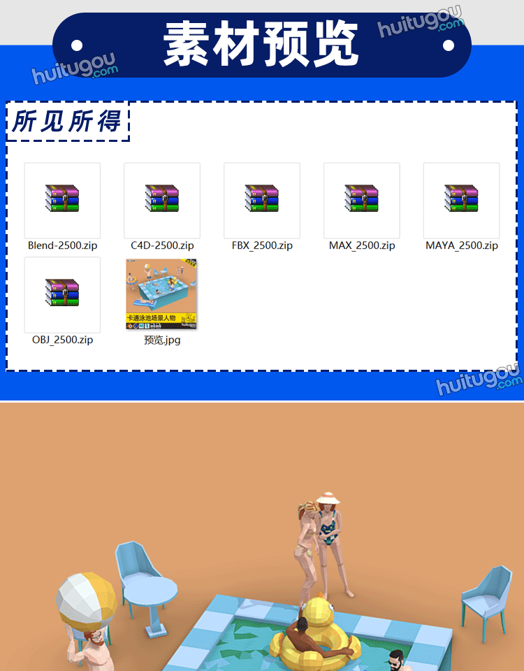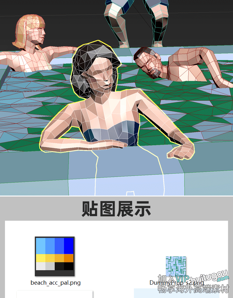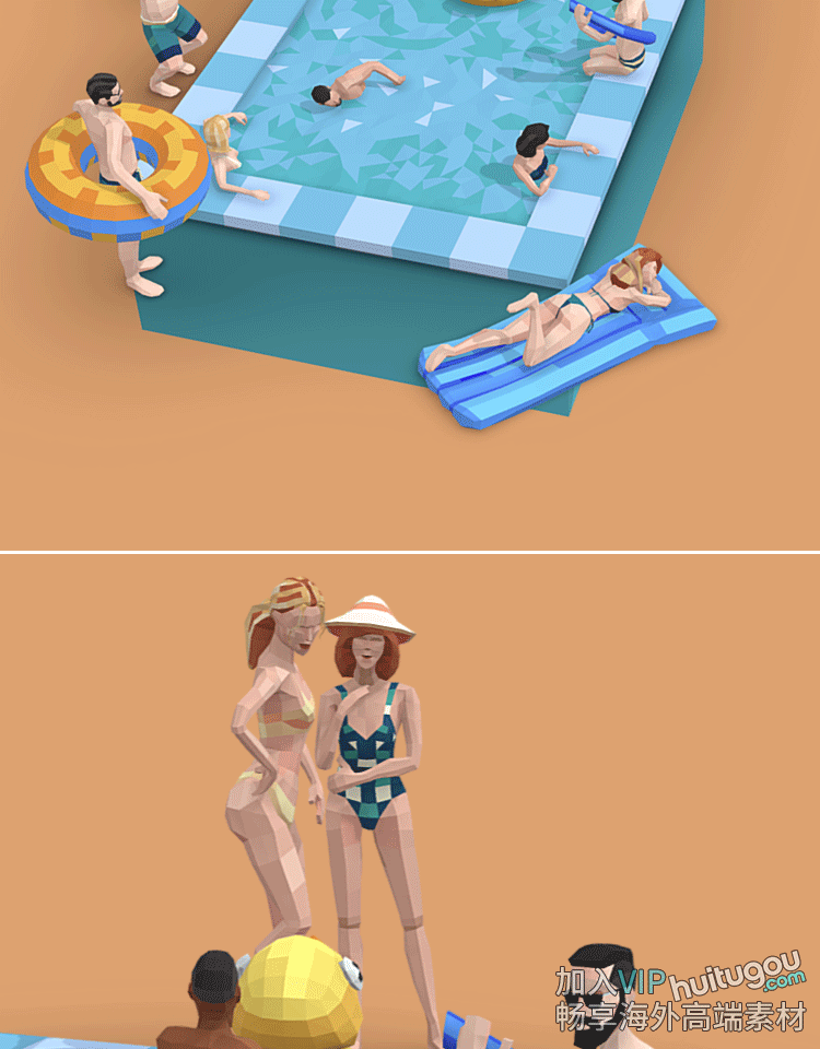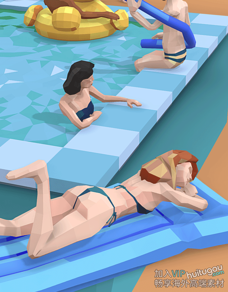 C4D低面卡通泳池场景3D模型素材C4D男女人物lowpoly风格资产包OBJ