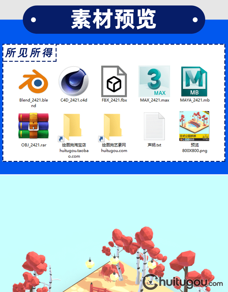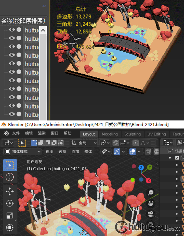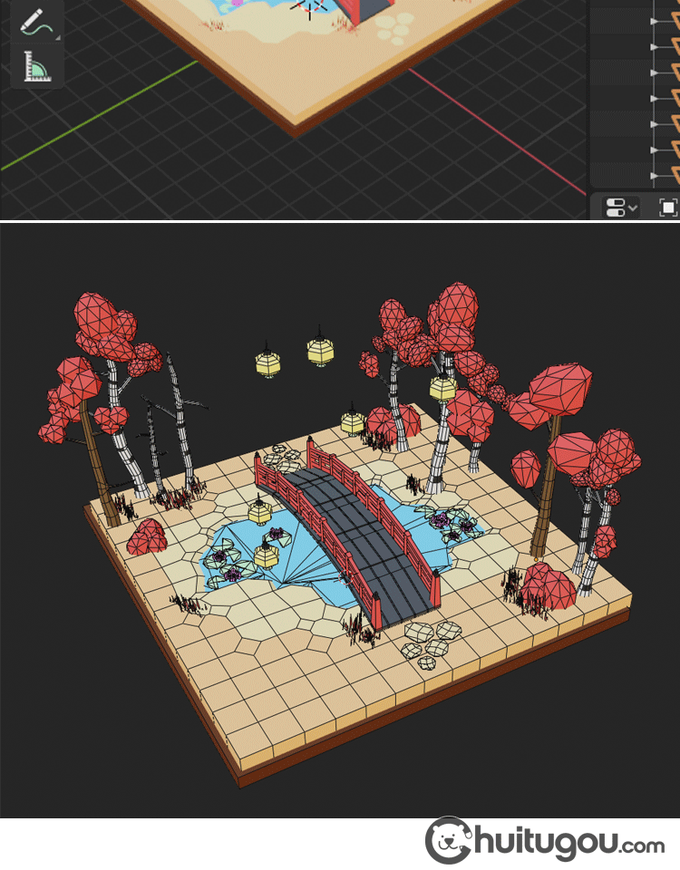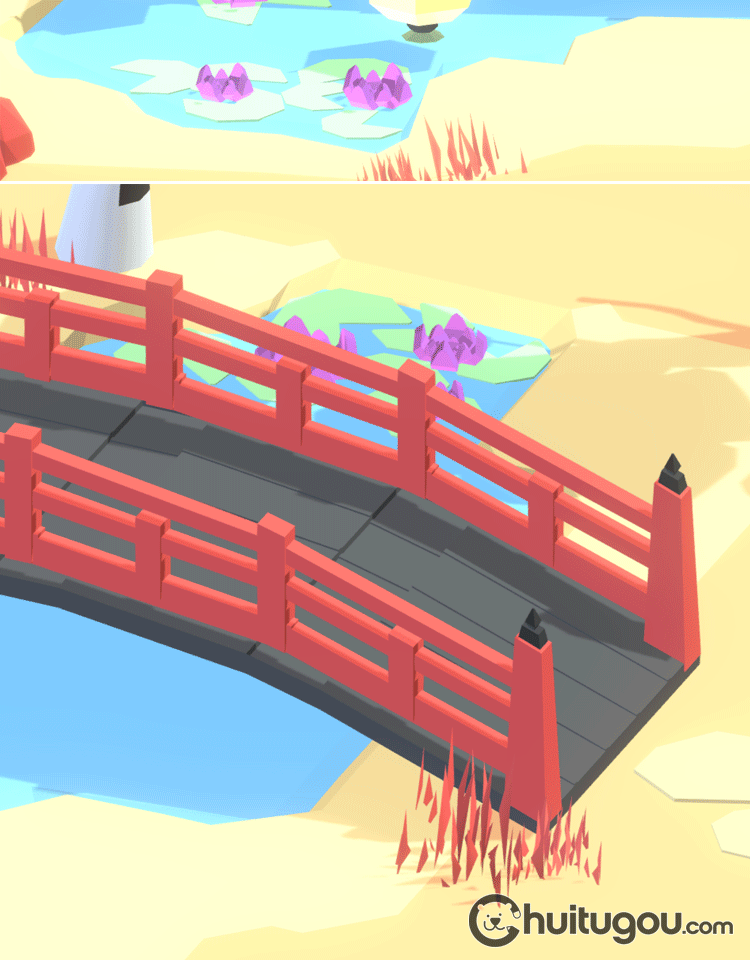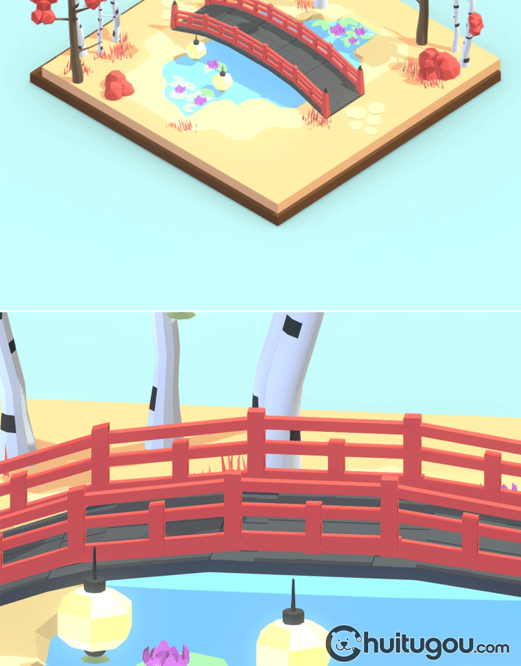 日式樱花公园模型C4D卡通唯美场景Blender拱桥池塘3D设计素材FBX