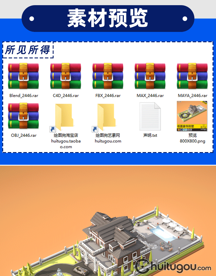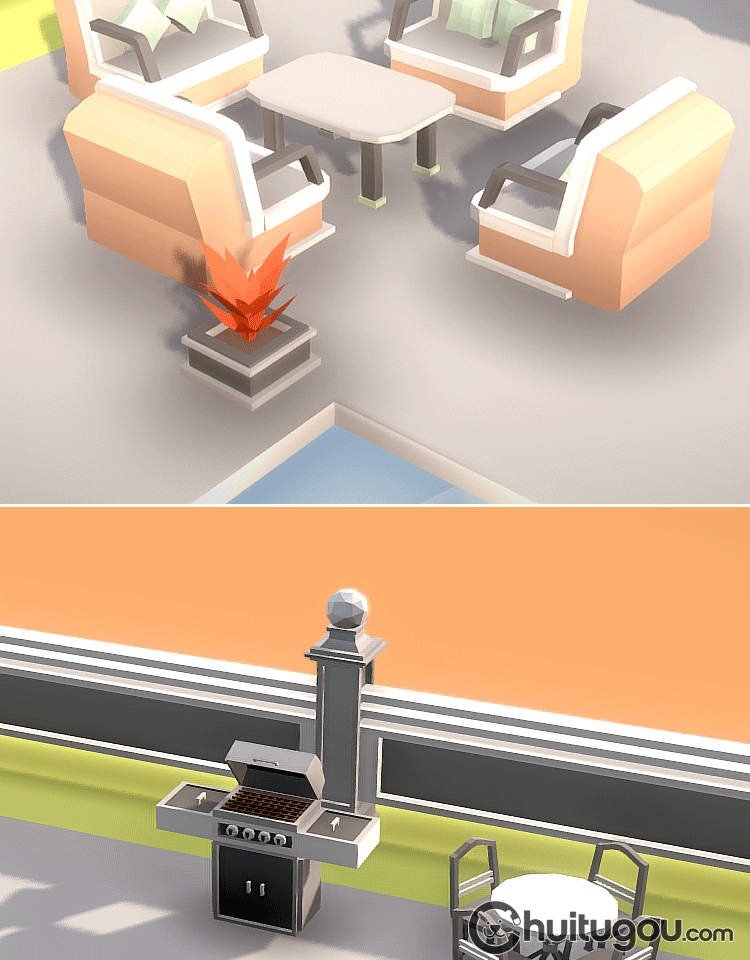 LOWPOLY风格豪宅场景C4D卡通别墅MAYA建筑楼房花园泳池FBX素材OBJ