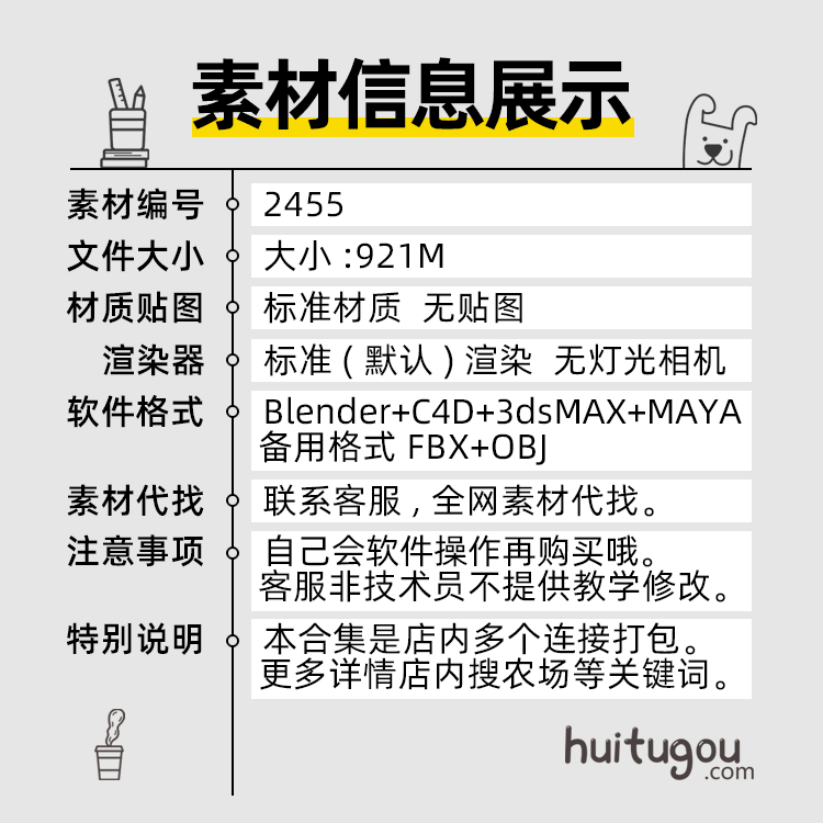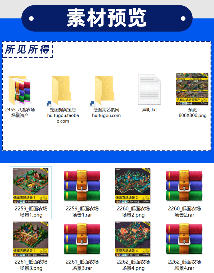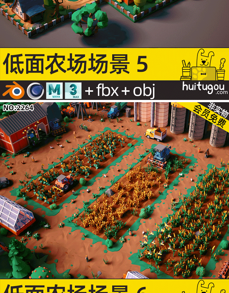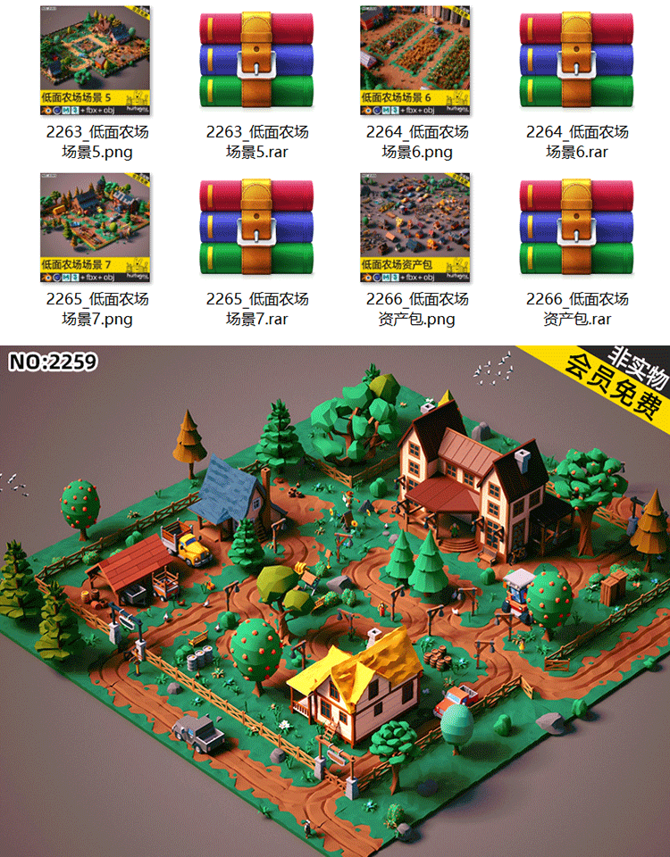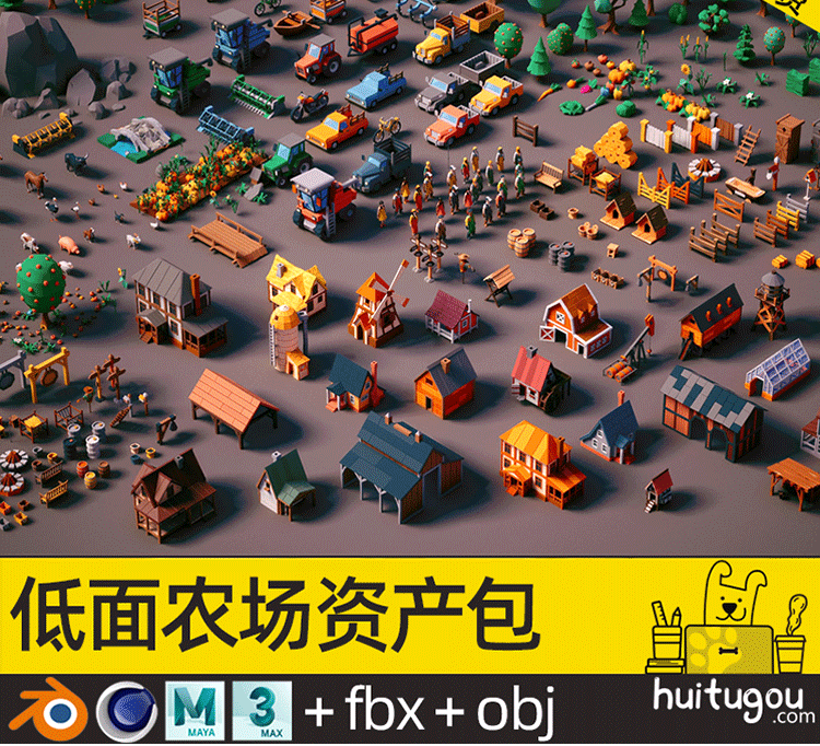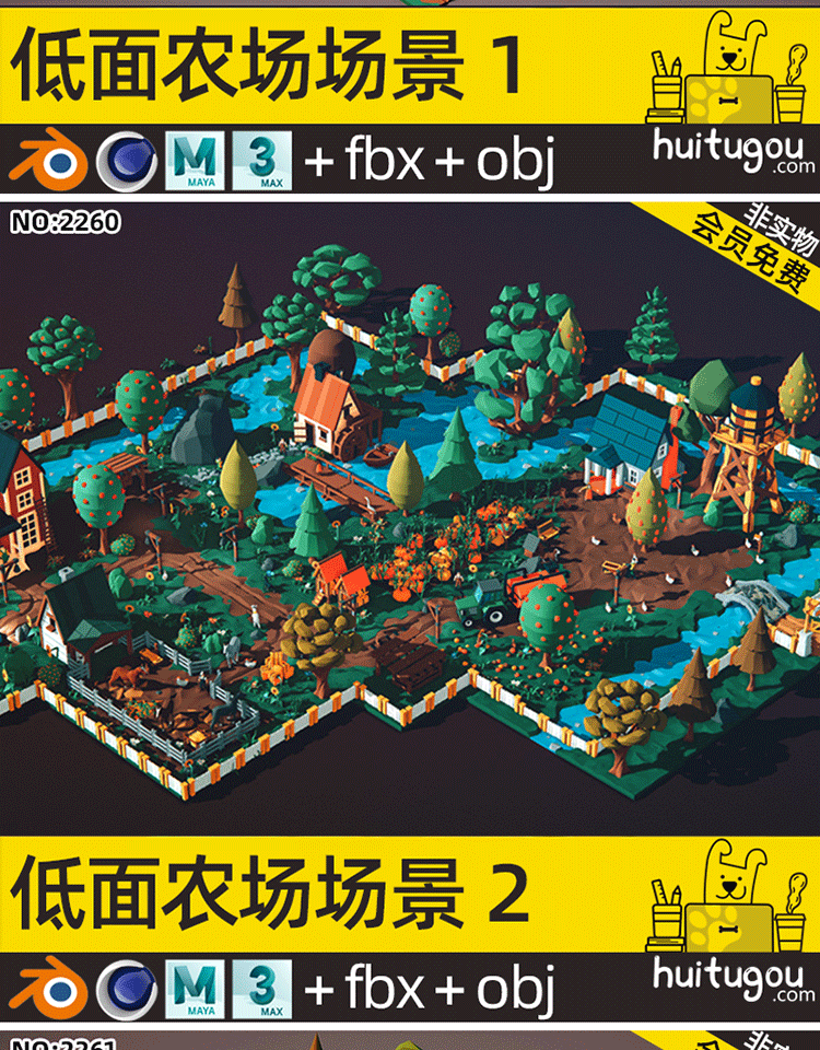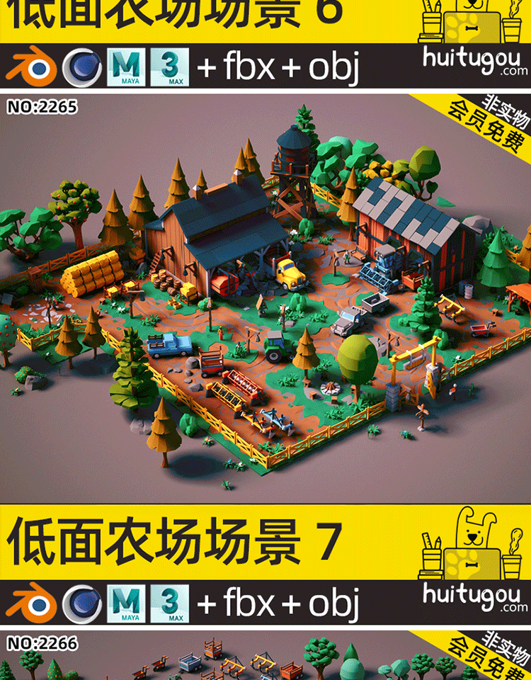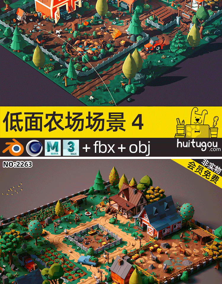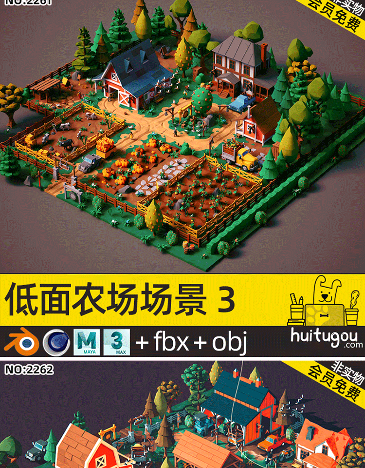 LOWPOLY风格C4D卡通农场场景3D模型Blend农田牧场果园木屋农具FBX