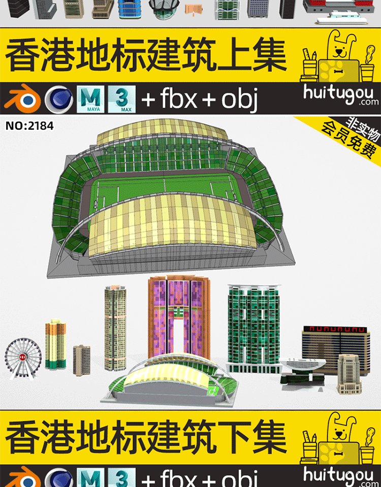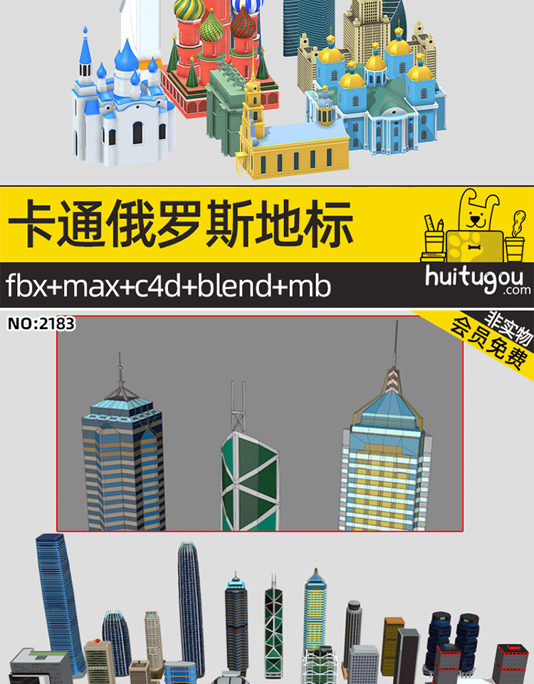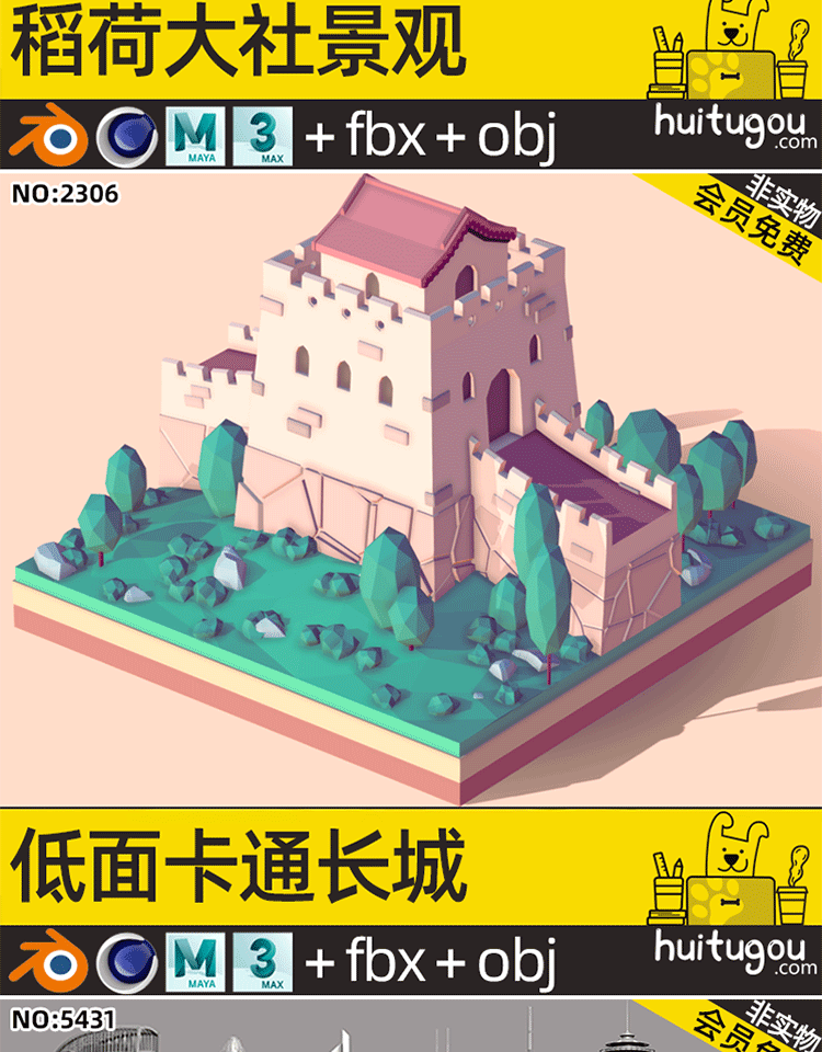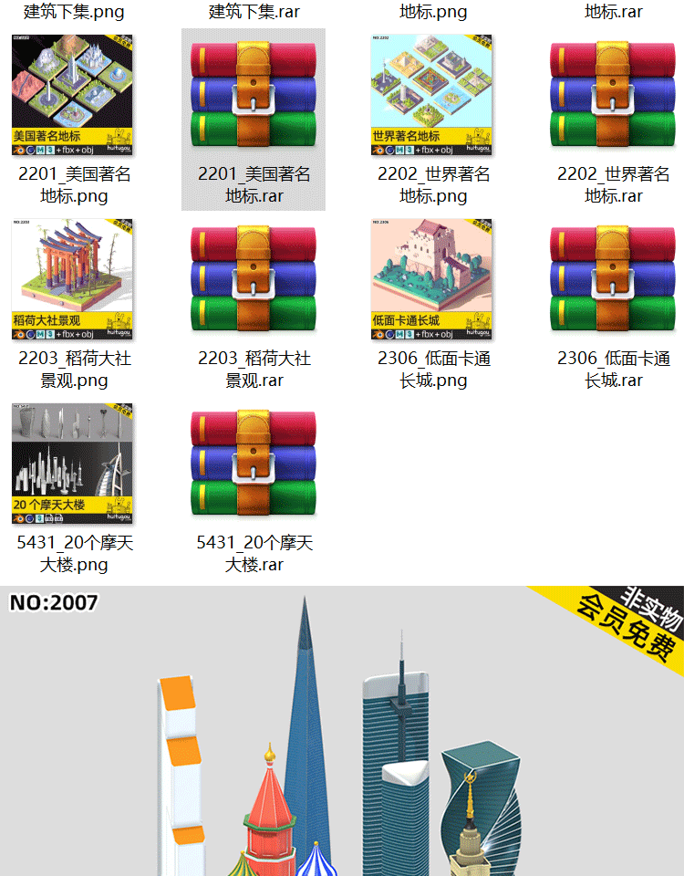 C4D卡通地标微缩3D场景MAYA长城香港建筑摩天大楼景点OBJ建模渲染