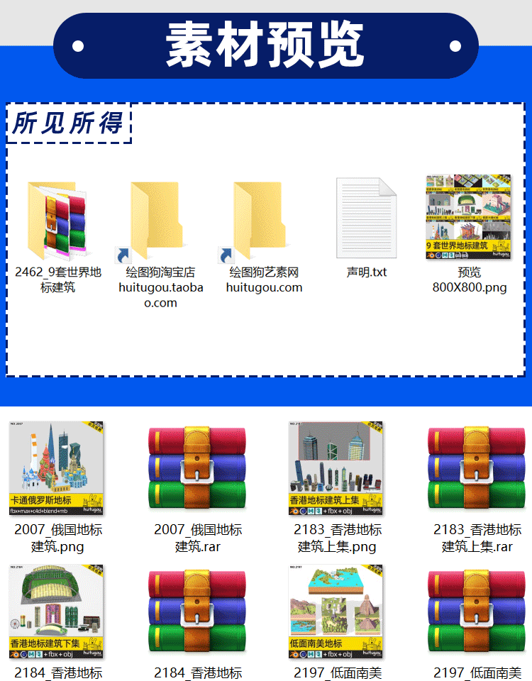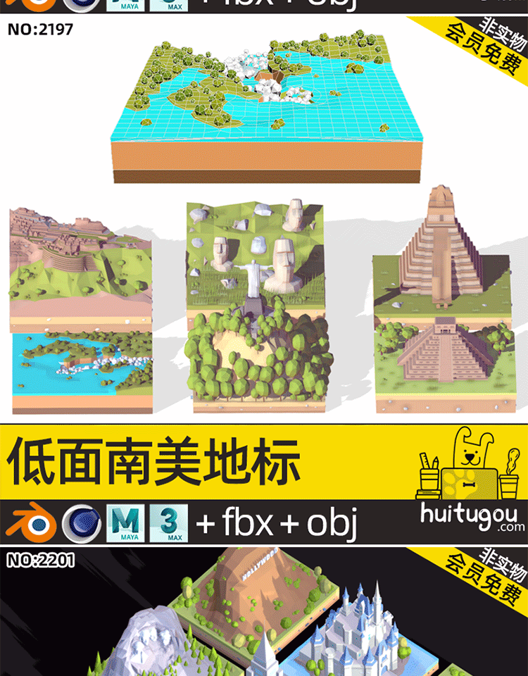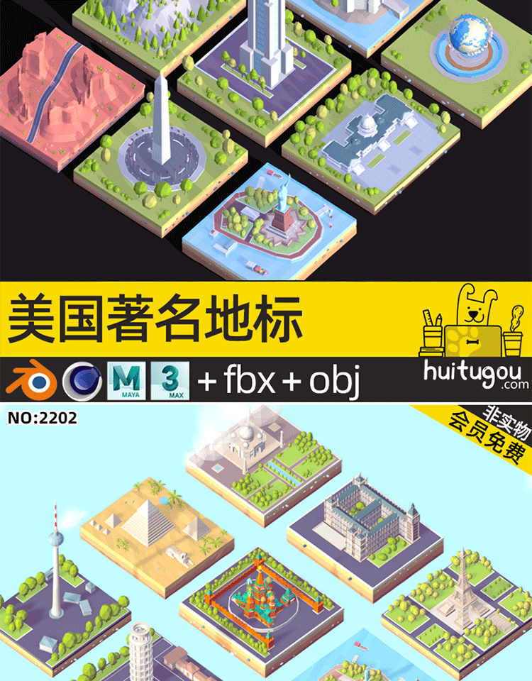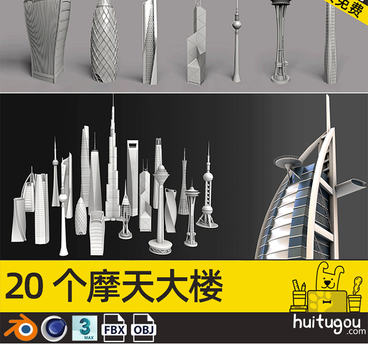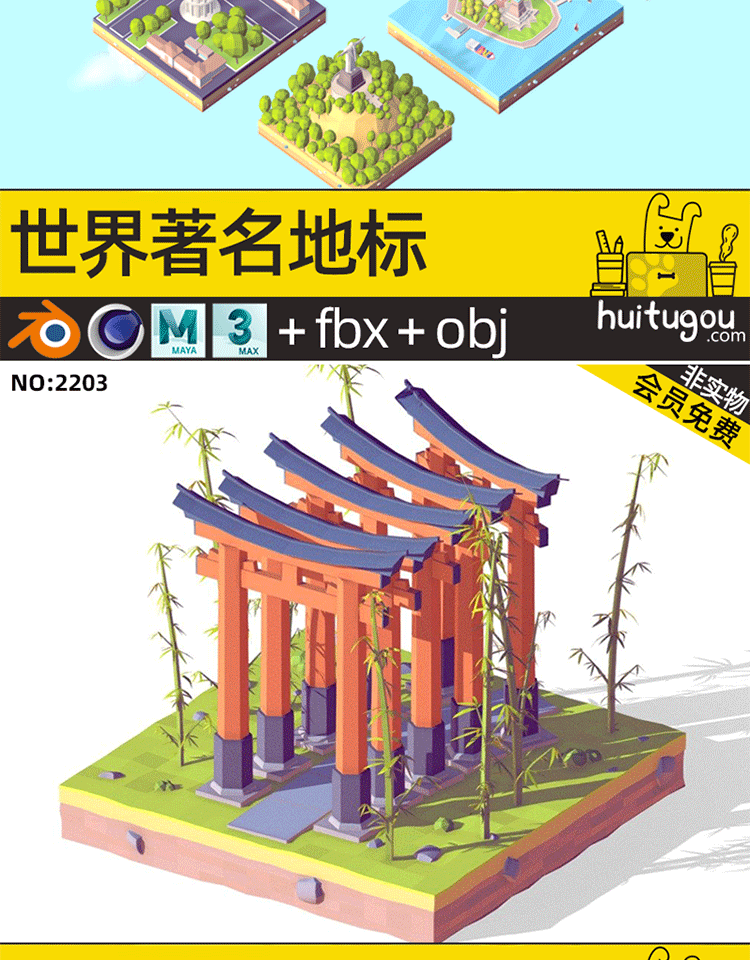 C4D卡通地标微缩3D场景MAYA长城香港建筑摩天大楼景点OBJ建模渲染