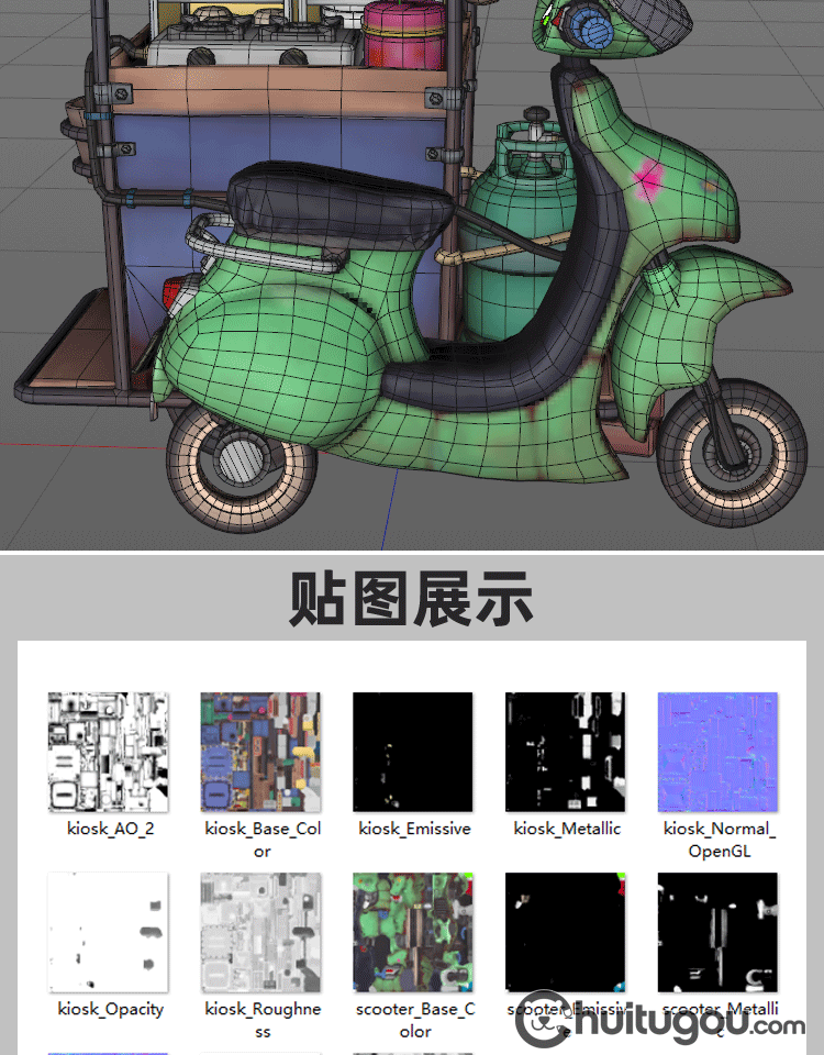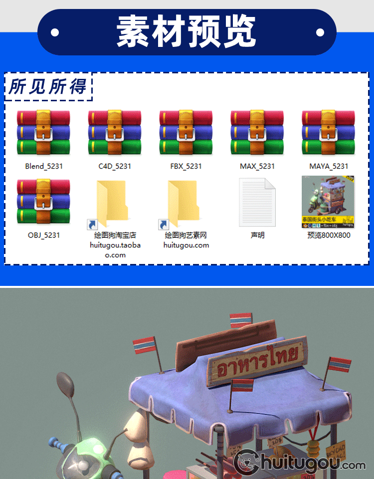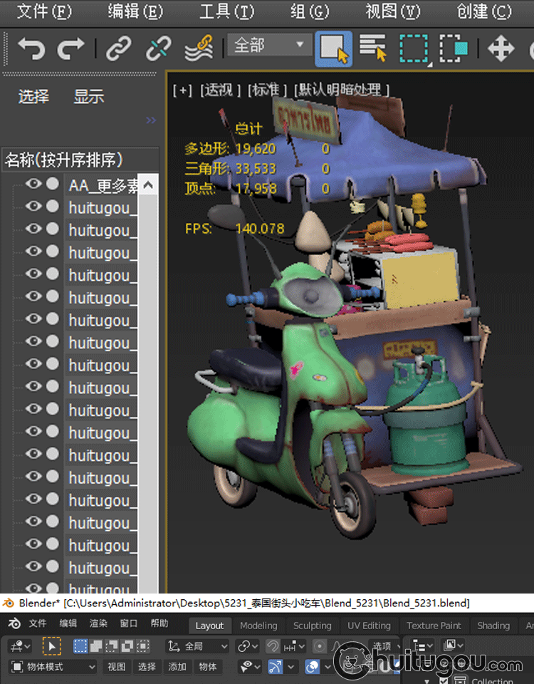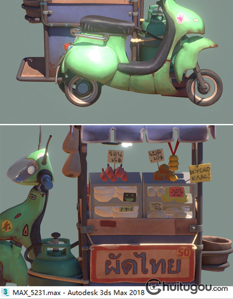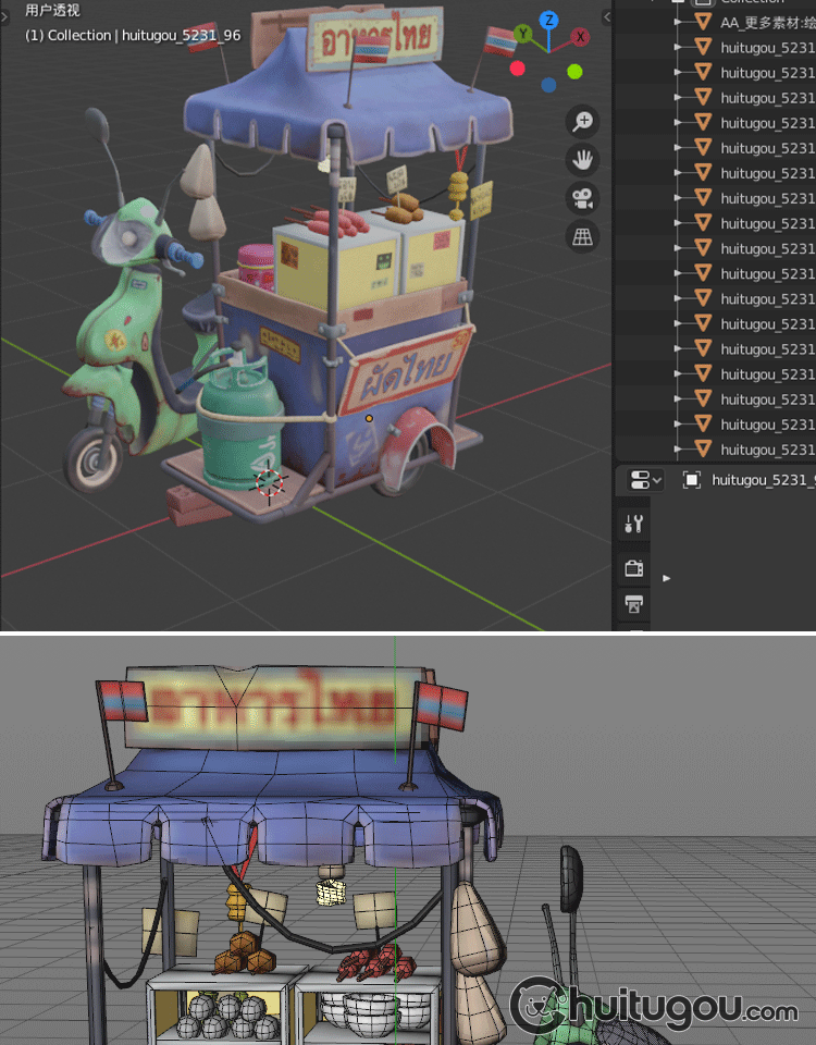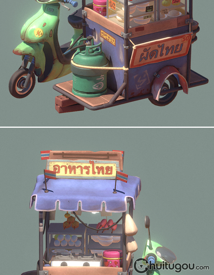 泰国街头小吃车模型Blend摊贩车餐车C4D三轮车卡通摩托车OBJ素材