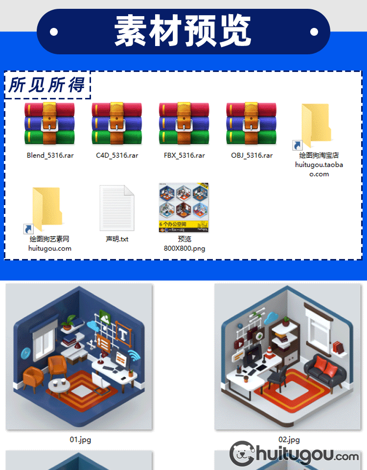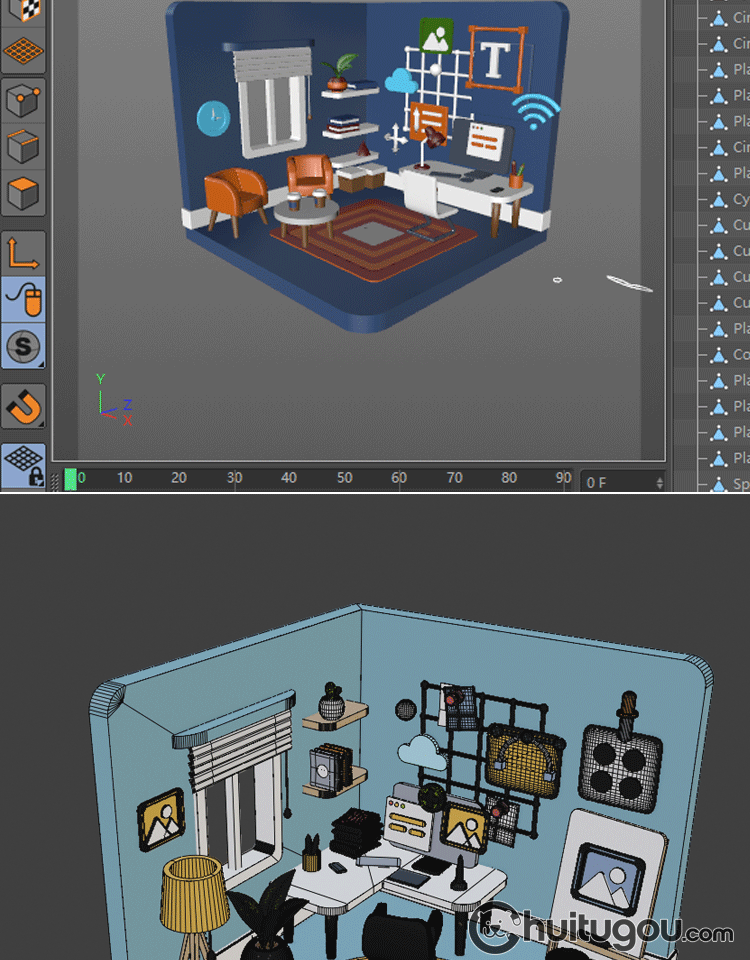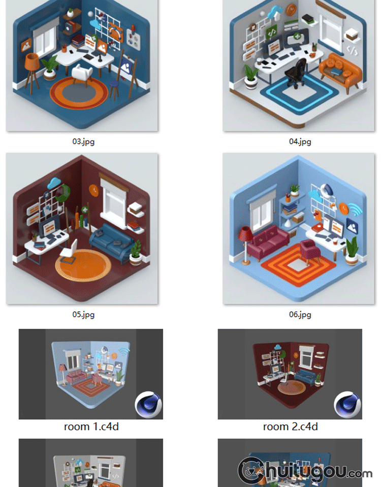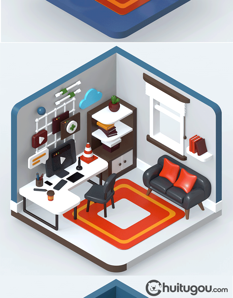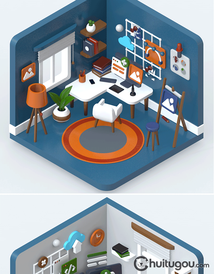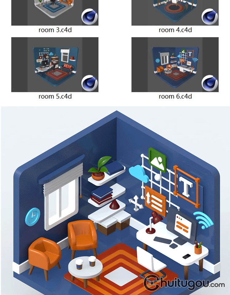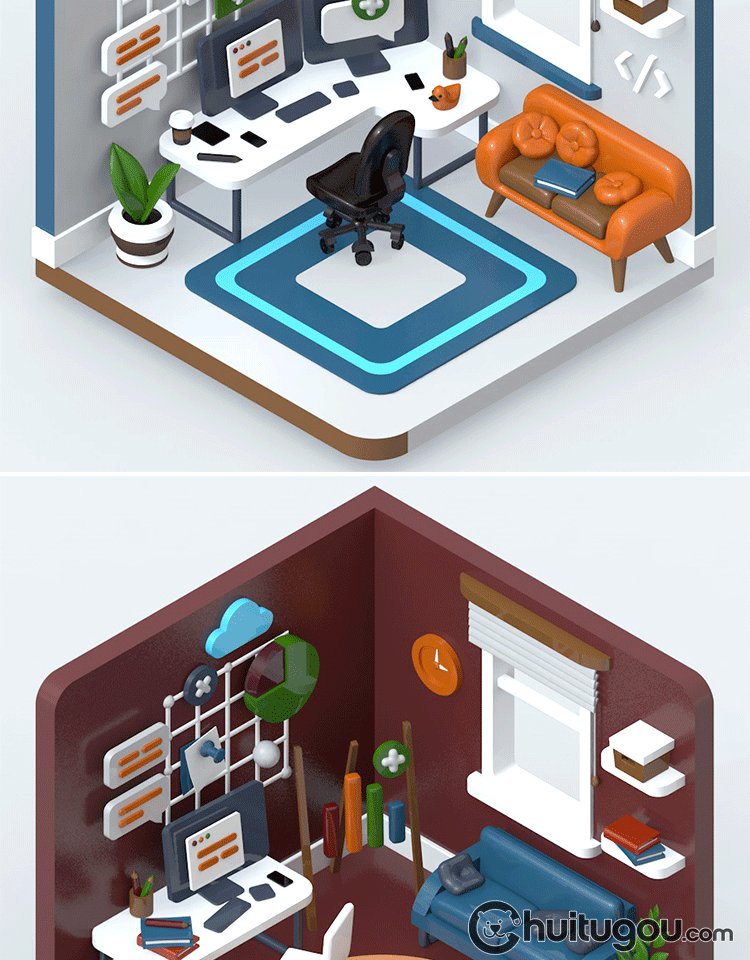 Q版书房办公室C4D卡通房间模型FBX桌椅沙发OBJ电脑3D设计素材文件
