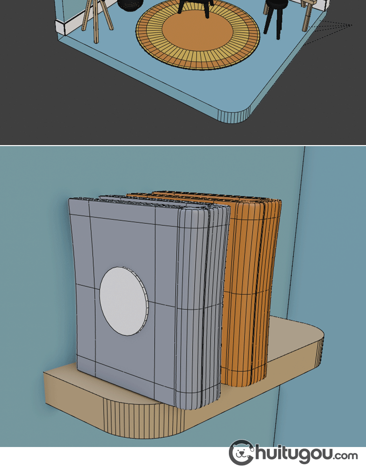 低面复式公寓C4D卡通阁楼房间模型MAX厨房餐厅挂画书桌书柜3D素材