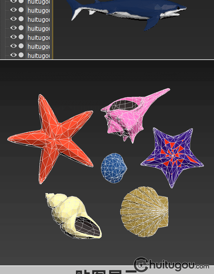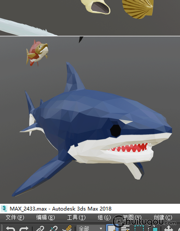 低面卡通海洋鱼类贝壳模型MAX海虾章鱼金枪鱼鲈鱼鲸鱼海螺扇贝OBJ