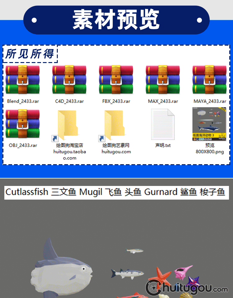 海洋咸水鱼类Blend小丑鱼C4D剑鱼鳀鱼FBX海豚虎鱼金鱼OBJ MAX mb