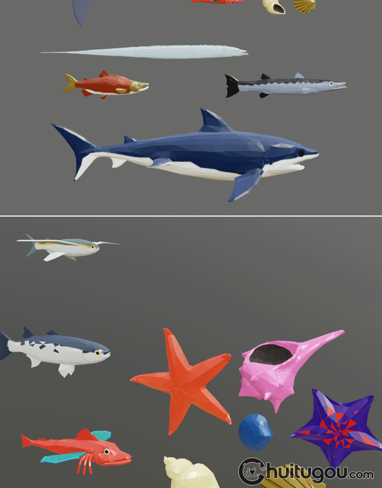 LOWPOLY卡通海洋鱼类鱼儿Blender三文鱼飞鱼梭子鱼鲨鱼3D模型素材