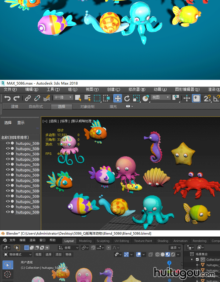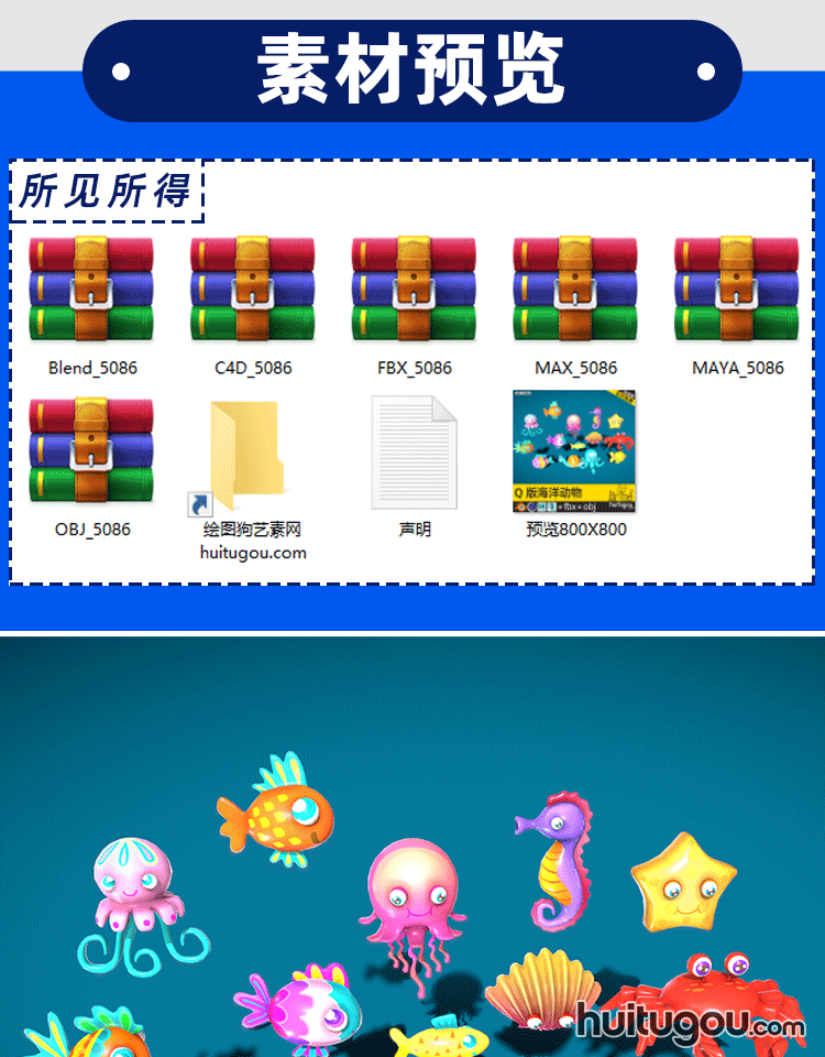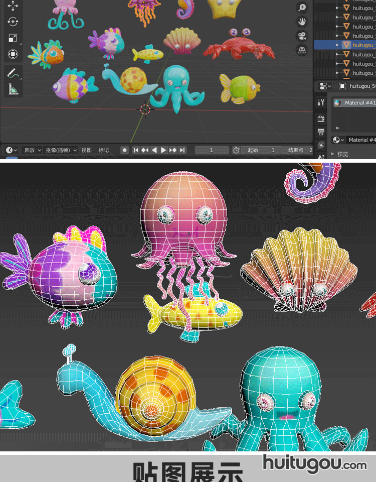 Q版 海洋生物包MAX模型C4D鱼儿Blend墨鱼海马螃蟹贝壳FBX OBJ文件
