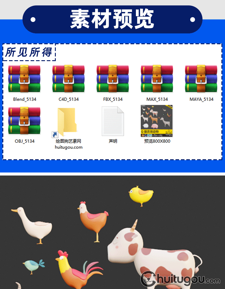 Q版 农场动物Blend模型C4D母鸡鹅鸭子马牛山羊绵羊FBX OBJ 3D素材