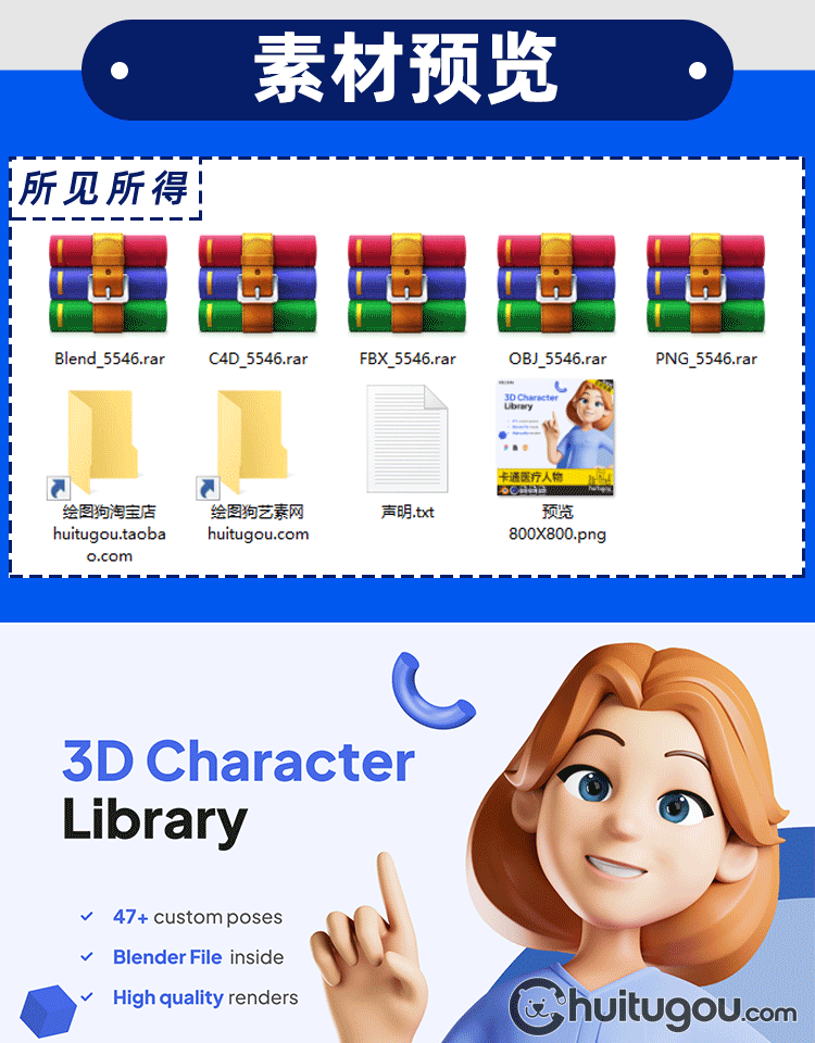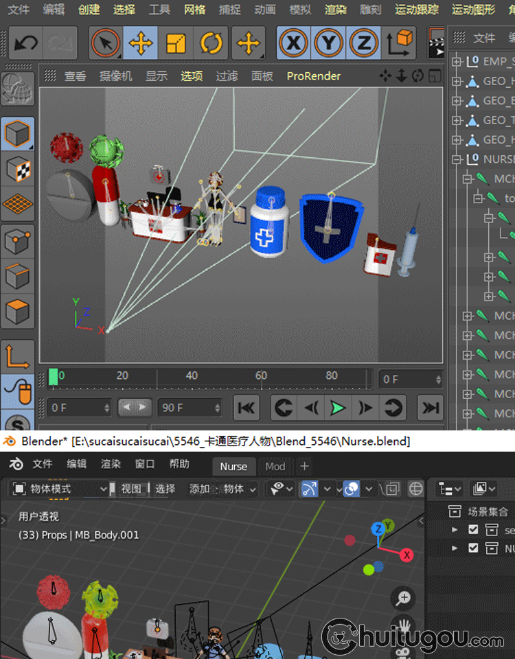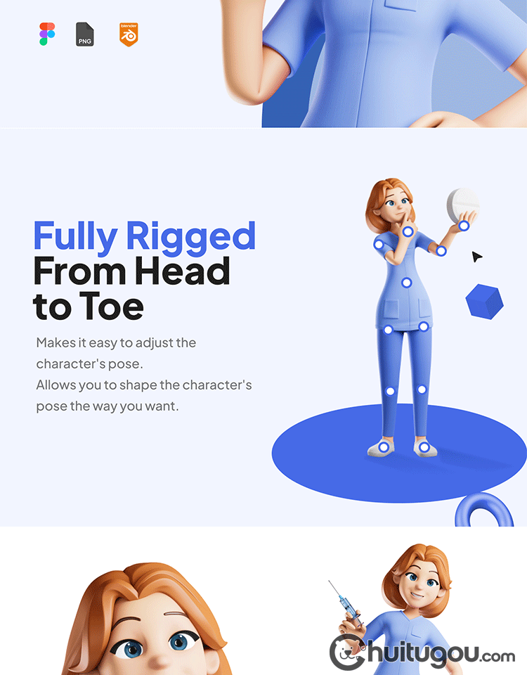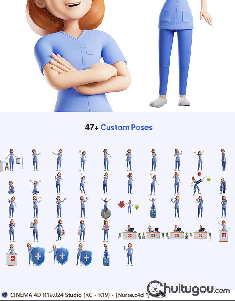 C4D医疗卡通护士人物blender模型FBX素材OBJ 带骨骼绑定 附png图