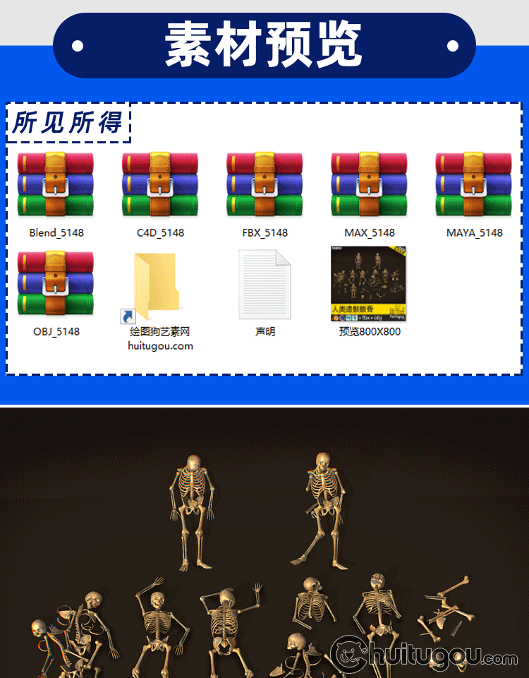 C4D人体骨骼3D模型MAX骷髅骨头骨架 FBX格式OBJ建模雕刻渲染素材
