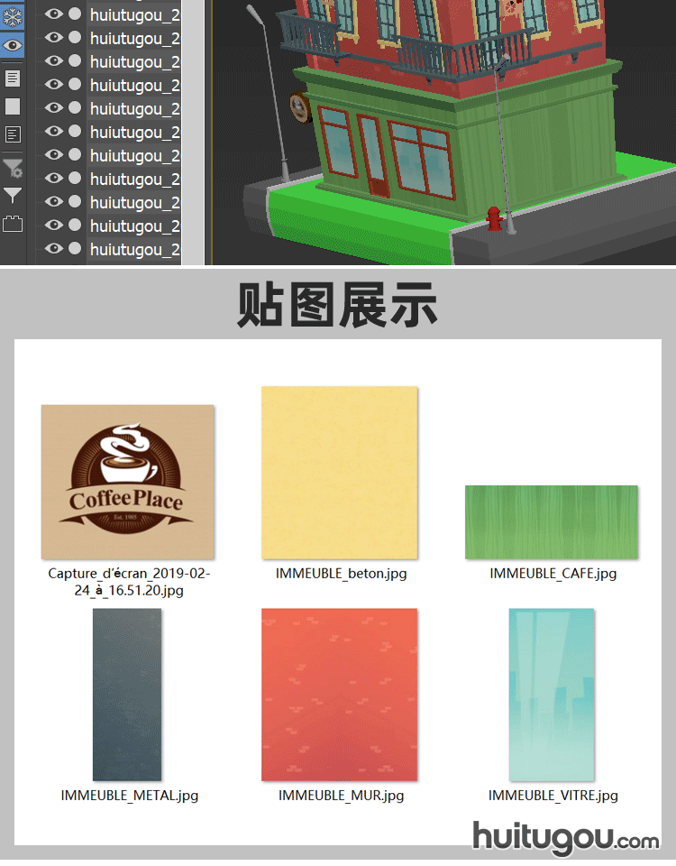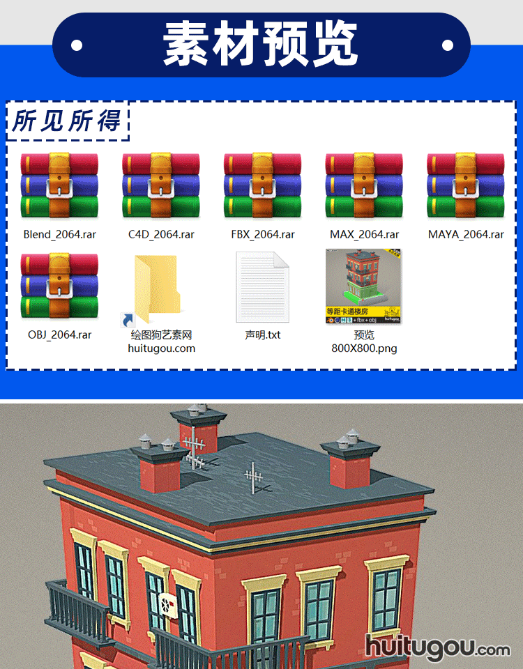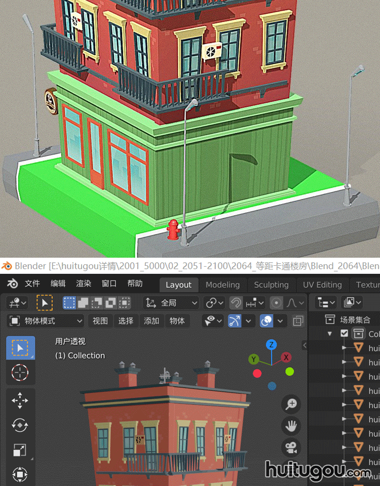 低多边形公寓楼C4D卡通建筑Blender消防栓FBX垃圾桶3D模型文件OBJ