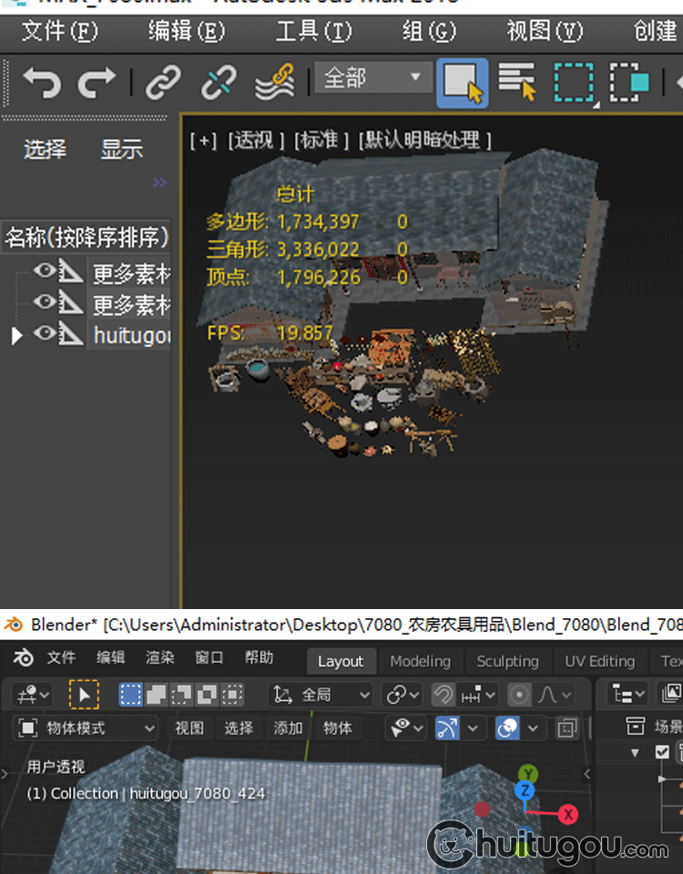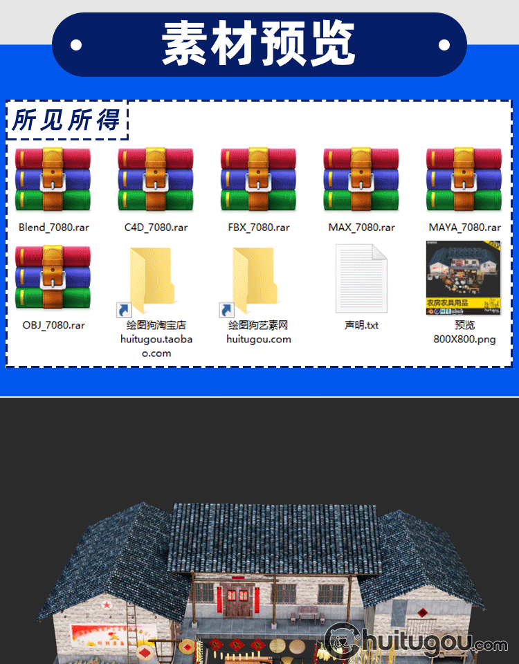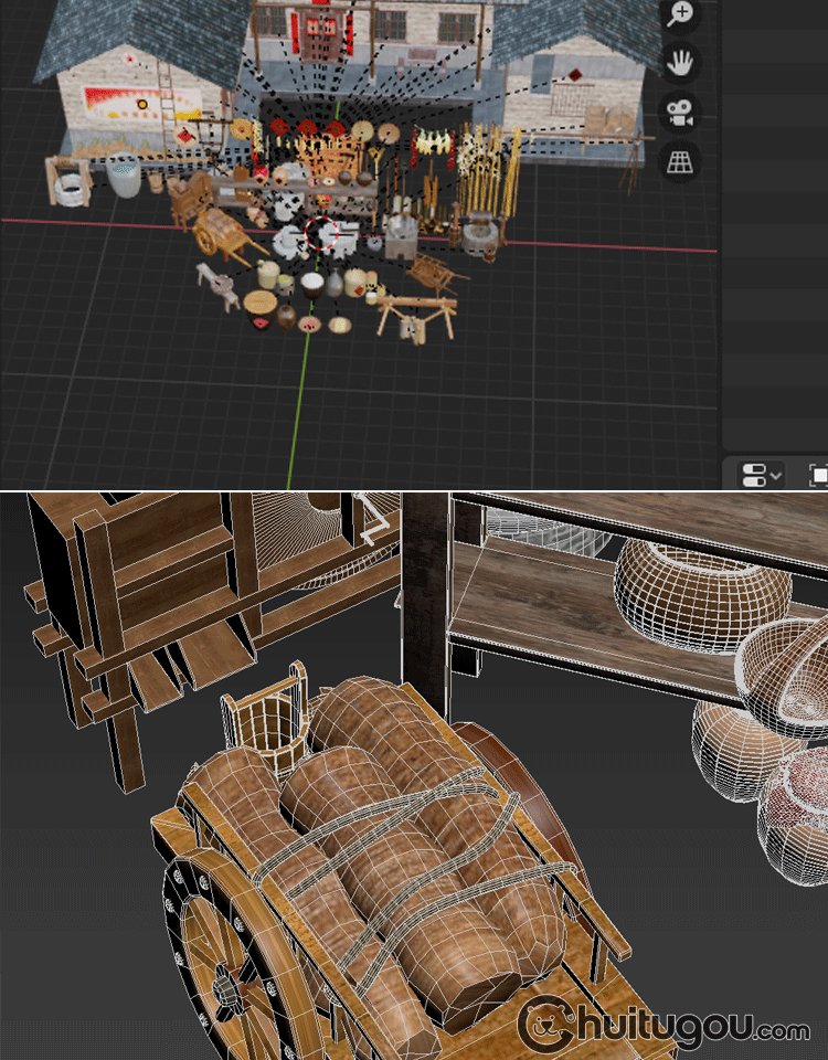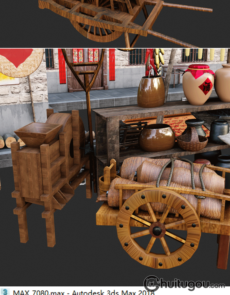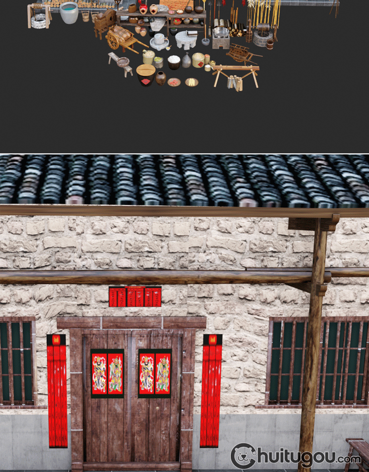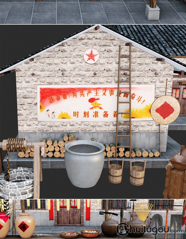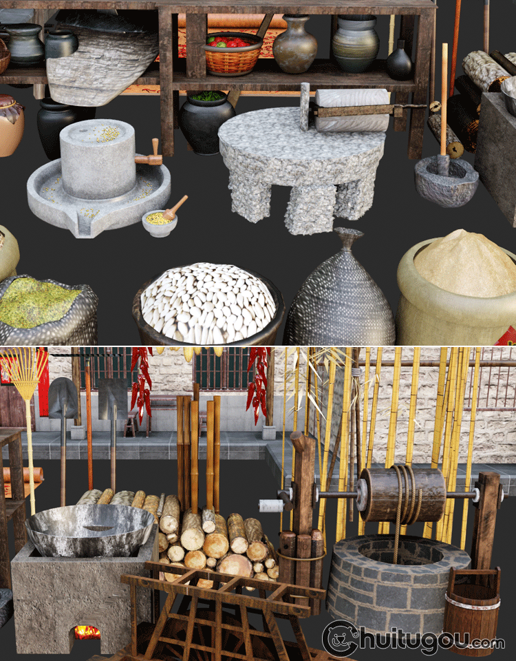 乡下土房农民房建筑C4D农具柴火独轮车水缸木桶石磨瓦罐3D素材FBX